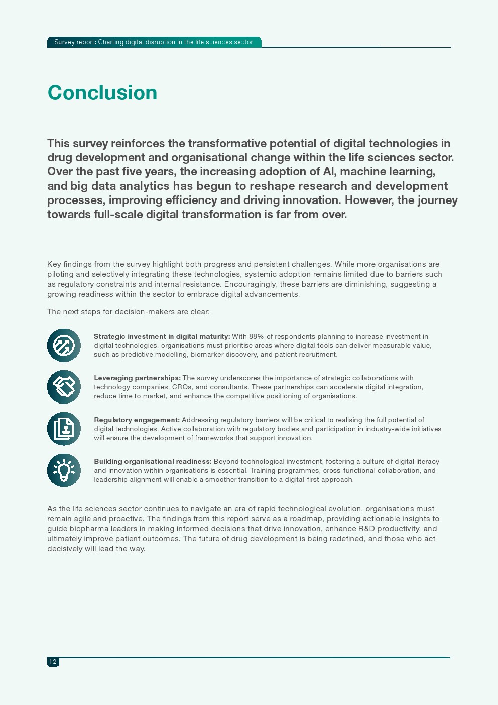 整体来看,生命科学行业的数字化转型正从概念探索进入规模化应用前夜。技术价值已得到行业普遍认可,资本投入也在快速增长,但真正的竞争优势将取决于企业能否在监管框架、数据整合与组织能力上实现系统化升级。未来几年,数字技术将逐渐从单点工具演变为贯穿药物研发全流程的基础设施,重塑全球生物医药创新格局。