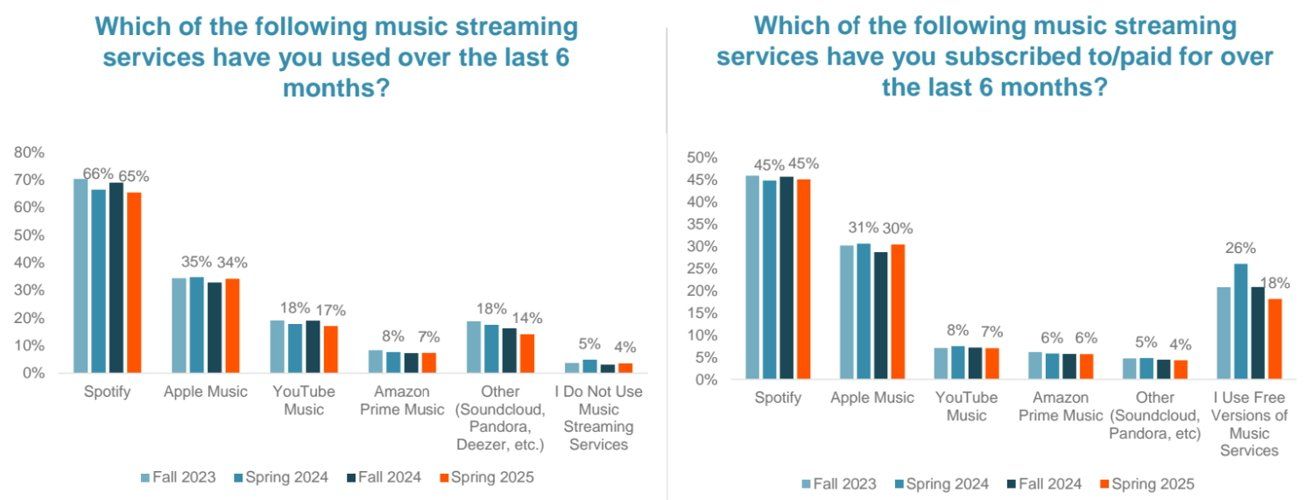 在Apple Music方面,这家库比蒂诺科技巨头的情况有所好转。当被问及过去六个月青少年使用过哪些流媒体服务时,34% 的人表示他们使用过 Apple Music,这使得这家音乐流媒体服务仍位居第二,市场份额相对持平。