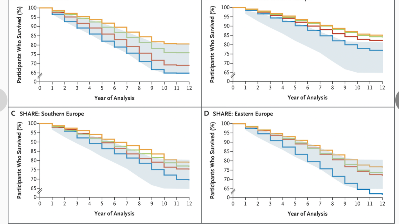 研究表明,最富裕四分之一人群的死亡率比最贫困四分之一人群低40%。在整个研究期间,欧洲大陆人群的死亡率比美国参与者低约40%。在研究期间,南欧参与者的死亡率估计比美国参与者低约30%,而东欧参与者的死亡率估计比美国参与者低13%至20%。