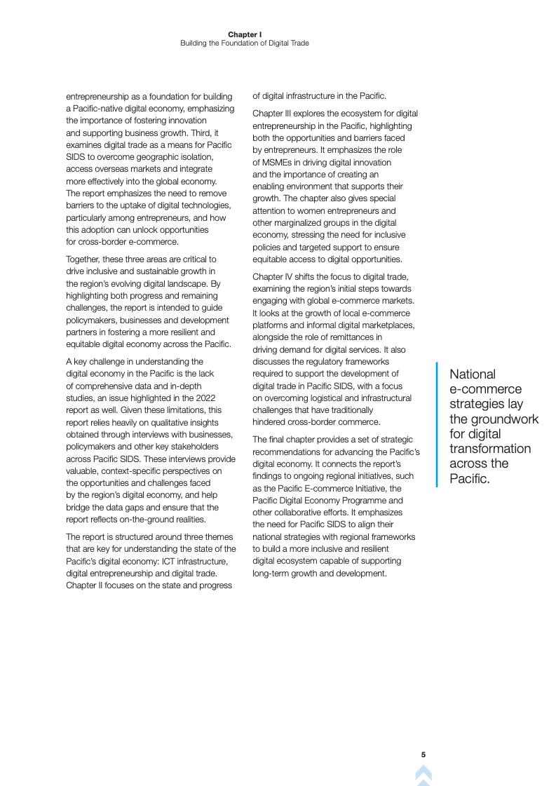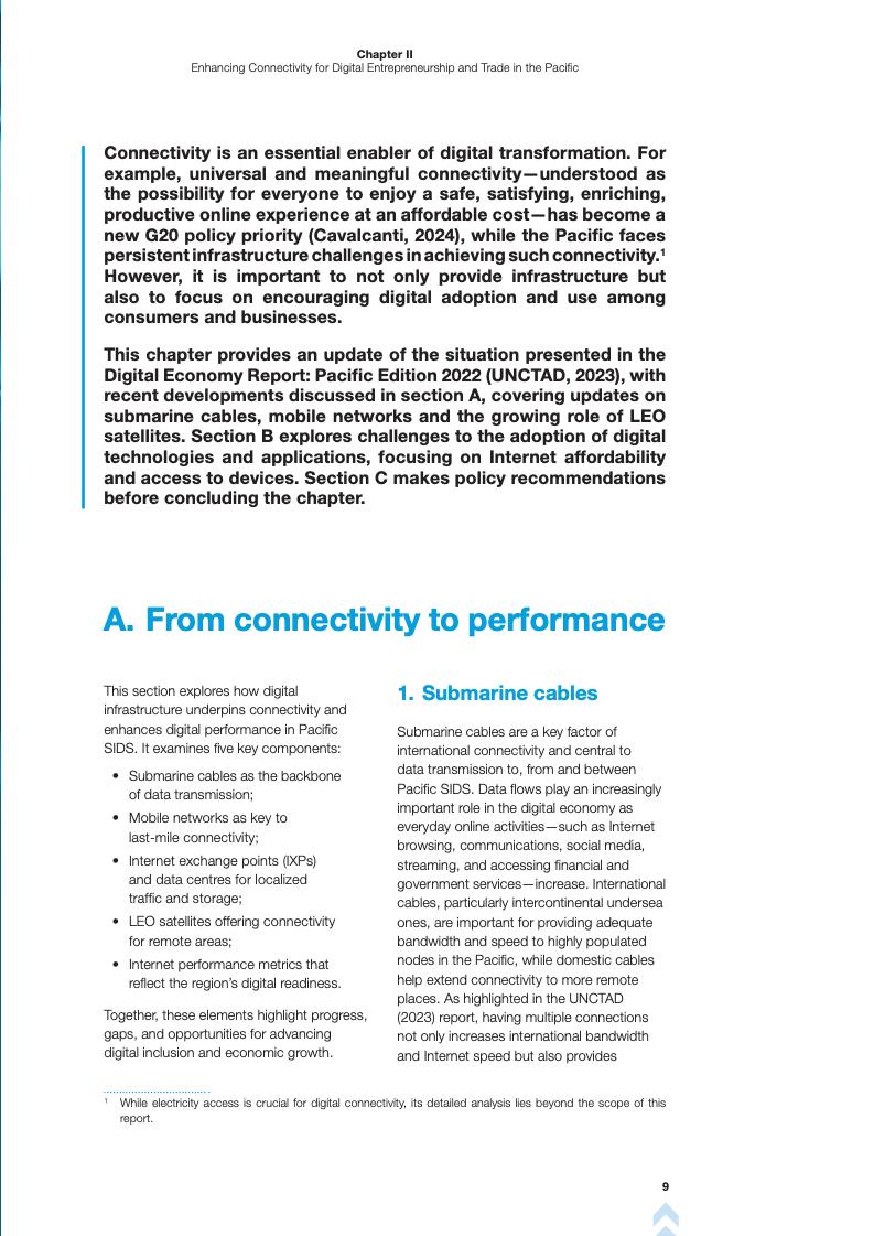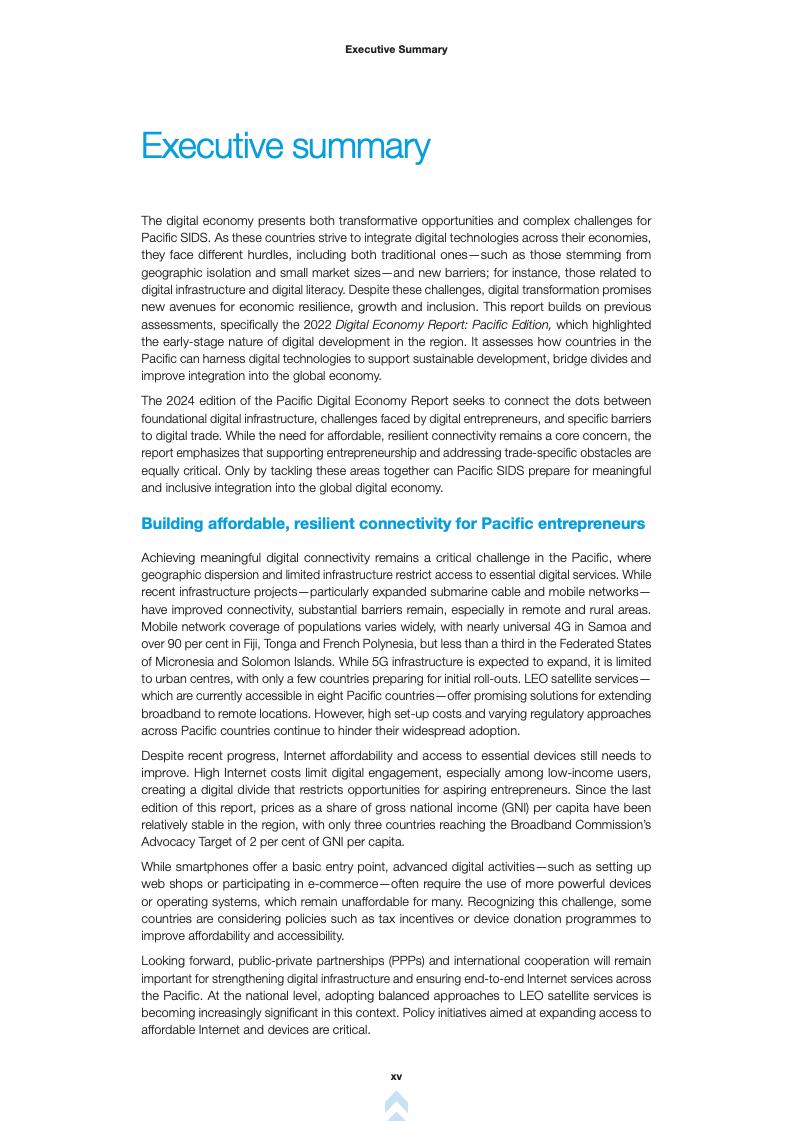 报告首先回顾了2022年报告的成果,并指出数字基础设施、创业和贸易之间的联系。报告强调,尽管太平洋地区在海底电缆和移动网络方面取得了进展,但地理分散和基础设施不足仍然限制了数字服务的获取。报告指出,低地球轨道(LEO)卫星服务为偏远地区提供了宽带接入的潜在解决方案,但高成本和不同的监管方法阻碍了其广泛采用。