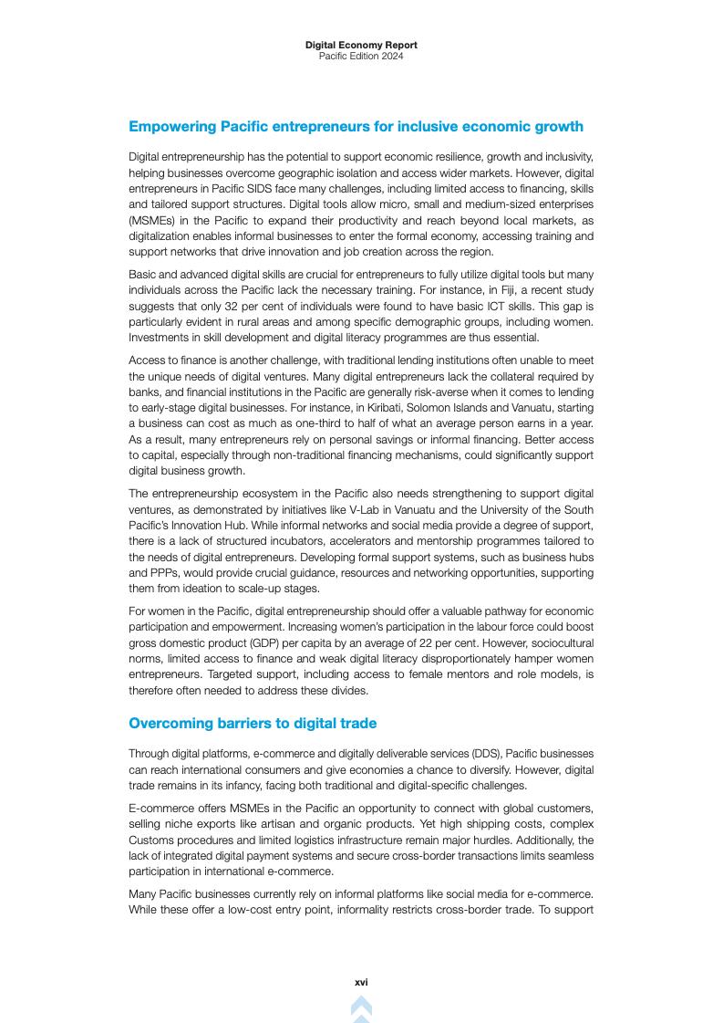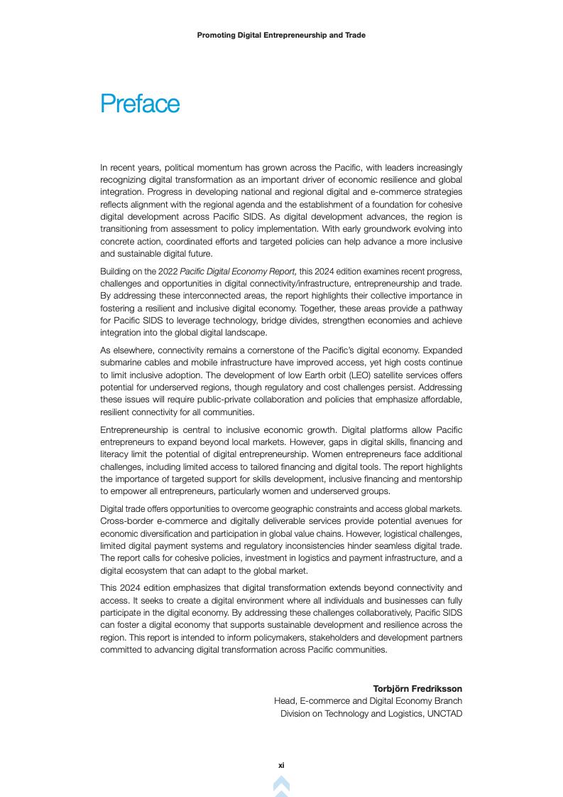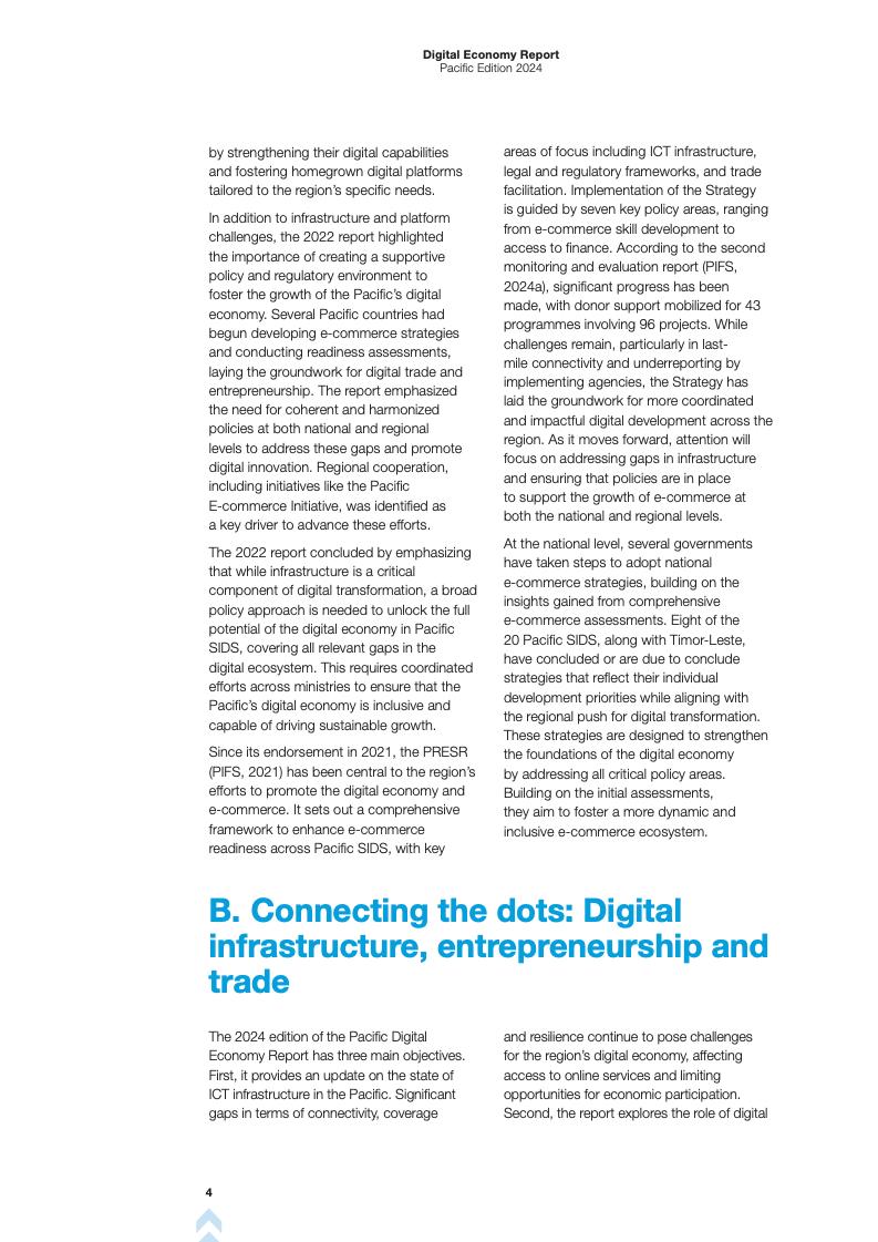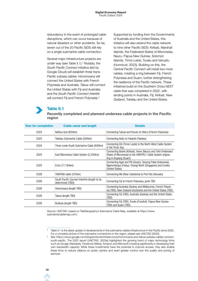 报告首先回顾了2022年报告的成果,并指出数字基础设施、创业和贸易之间的联系。报告强调,尽管太平洋地区在海底电缆和移动网络方面取得了进展,但地理分散和基础设施不足仍然限制了数字服务的获取。报告指出,低地球轨道(LEO)卫星服务为偏远地区提供了宽带接入的潜在解决方案,但高成本和不同的监管方法阻碍了其广泛采用。