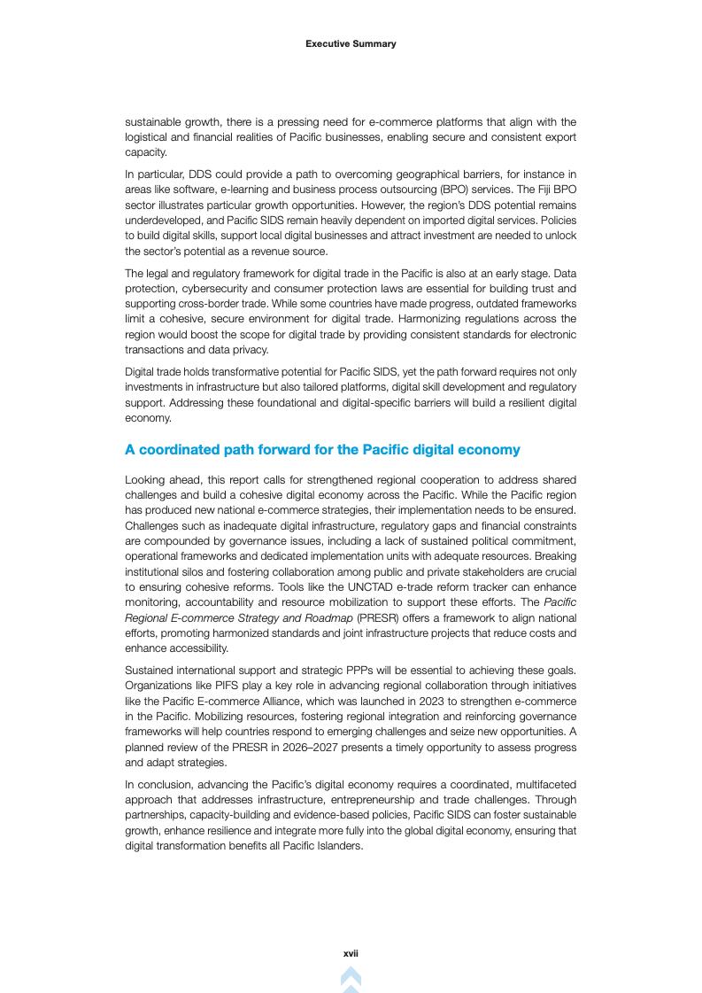 报告指出,尽管数字贸易为太平洋地区提供了克服地理隔离和进入全球市场的机会,但物流挑战、有限的数字支付系统和监管不一致等问题阻碍了数字贸易的无缝进行。报告还探讨了旅游平台在数字贸易中的作用,并强调了建立信任和支持跨境交易的法律框架的重要性。