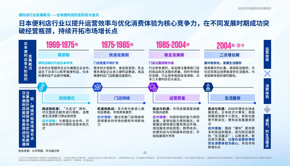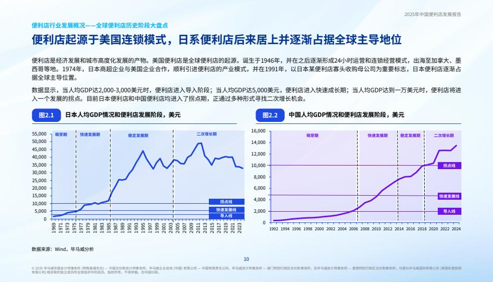 数据显示,当人均GDP达2,000-3,000美元时,便利店进入导入阶段;当人均GDP达5,000美元,便利店进入快速成长期;当人均GDP达到一万美元时,便利店将进入一个发展的拐点。目前日本便利店和中国便利店均进入了拐点期,正通过多种形式寻找二次增长机会。