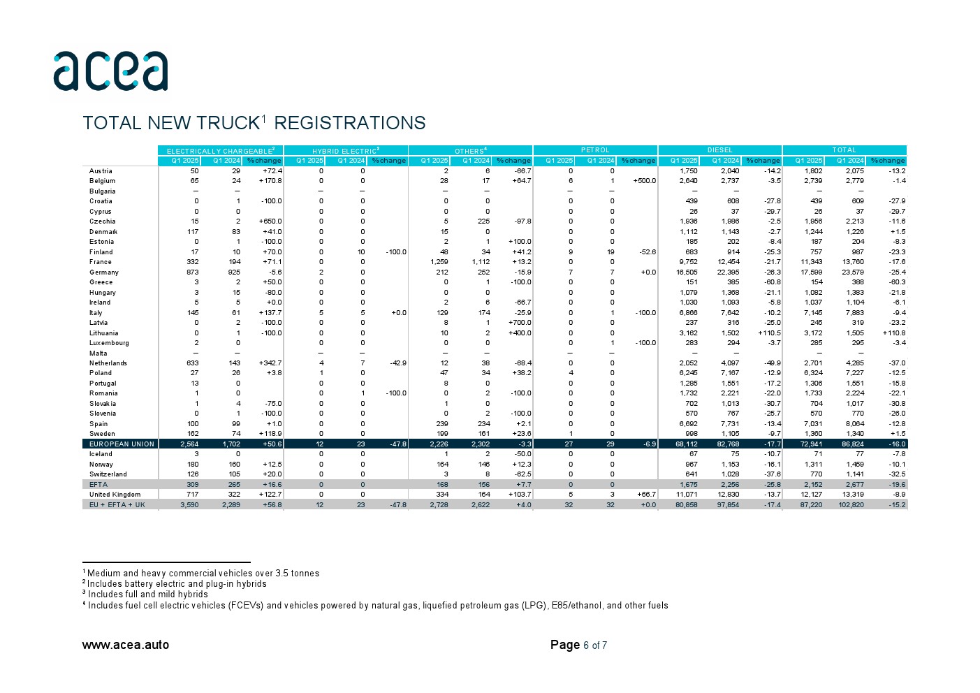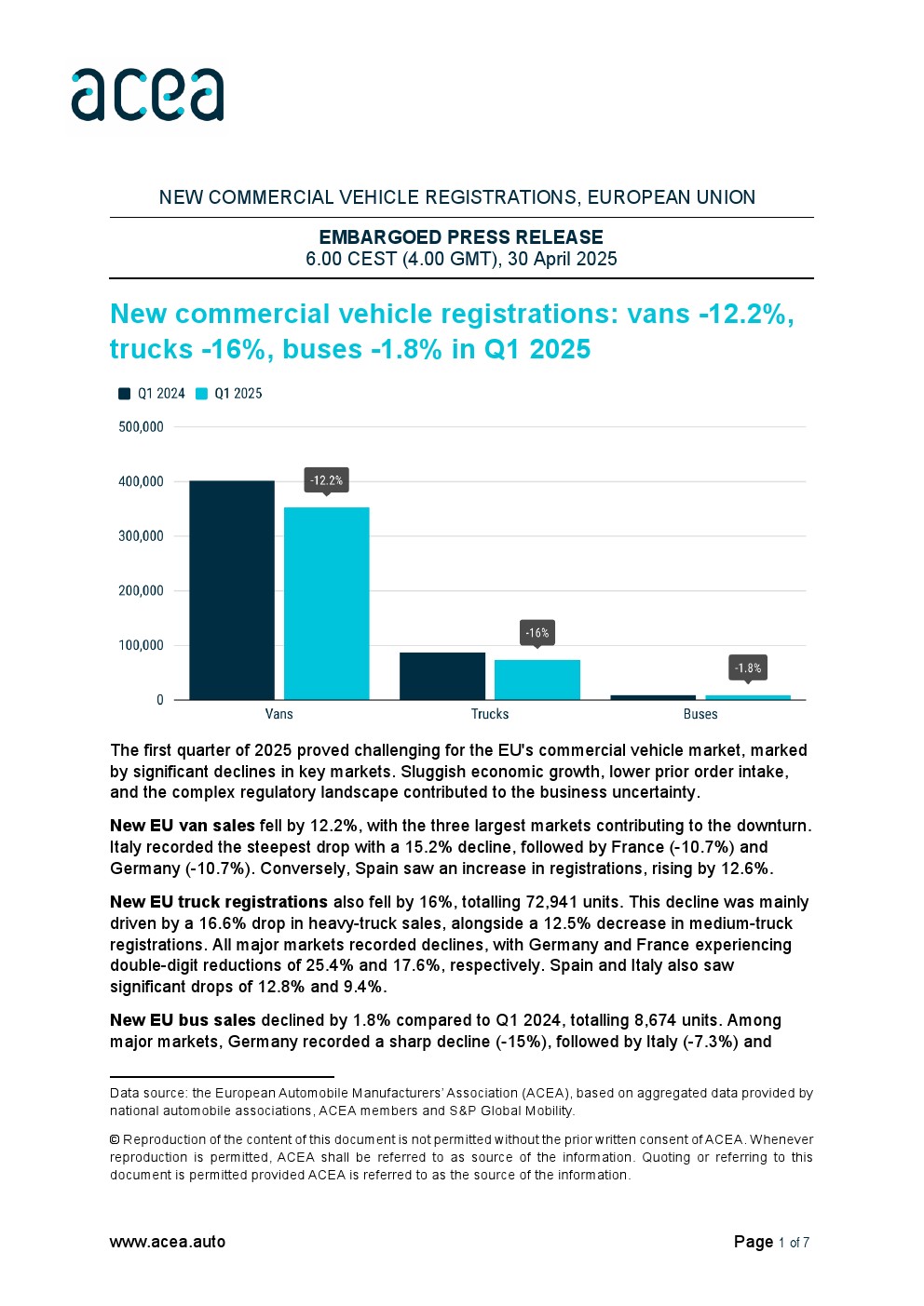 2025年第一季度欧盟商用车市场面临严峻挑战,主要市场均出现显著下滑。经济增长乏力、前期订单量减少以及复杂的监管环境加剧了商业不确定性。