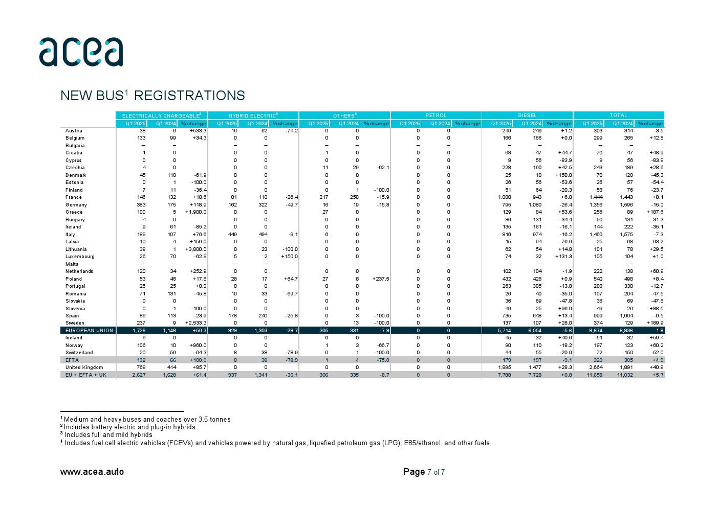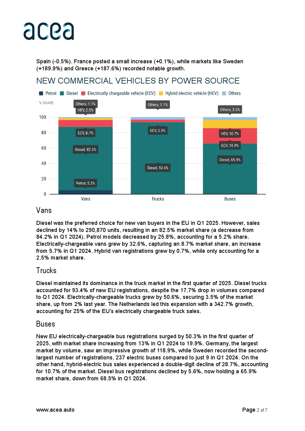 欧盟客车新注册量较2024年第一季度下降1.8%,达到8,674辆。德国大幅下滑15%,意大利(-7.3%)和西班牙(-0.5%)跟跌。法国微增0.1%,瑞典(+189.9%)和希腊(+187.6%)则实现显著增长。