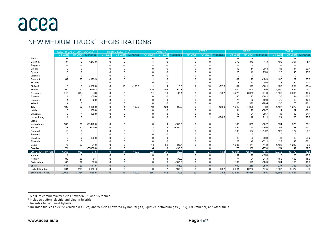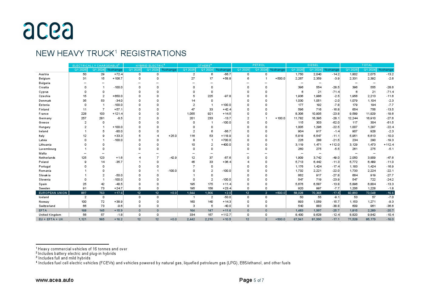 欧盟卡车新注册量下降16%,达到72,941辆,主要源于重型卡车销量下滑16.6%及中型卡车减少12.5%。所有主要市场均下跌:德国(-25.4%)和法国(-17.6%)出现两位数降幅,西班牙(-12.8%)和意大利(-9.4%)跌幅明显。