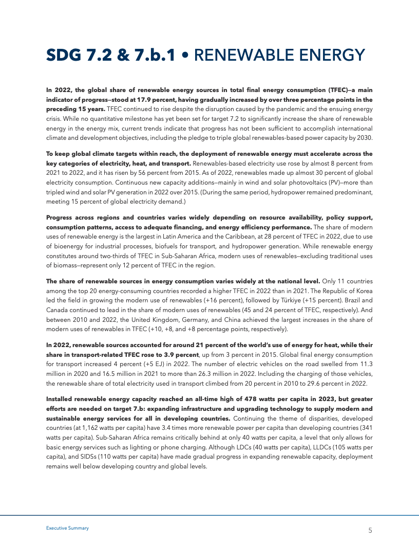 2022年,在全球最终能源消费总量持续稳步增长的情况下,可再生能源占比达到17.9%。2023年全球人均可再生能源装机容量达478瓦,较2022年增长近13%。但当前进展仍不足以实现国际气候与可持续发展目标。