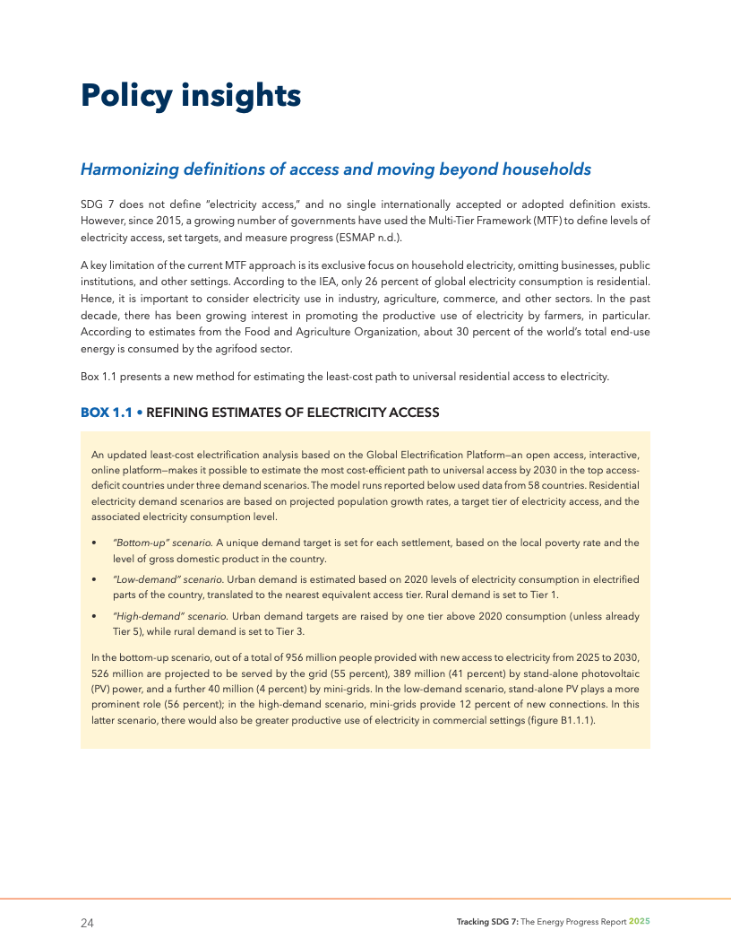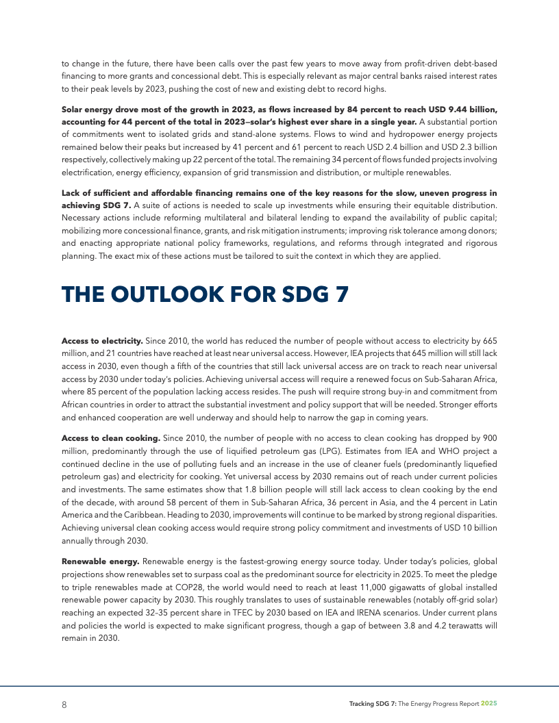 报告表示,亟需采取的行动包括:改革多边及双边贷款机制以扩大公共资本供给;增加优惠融资、赠款和风险缓释工具的运用;提升捐助方的风险承受能力;同时完善各国能源政策规划与监管框架。