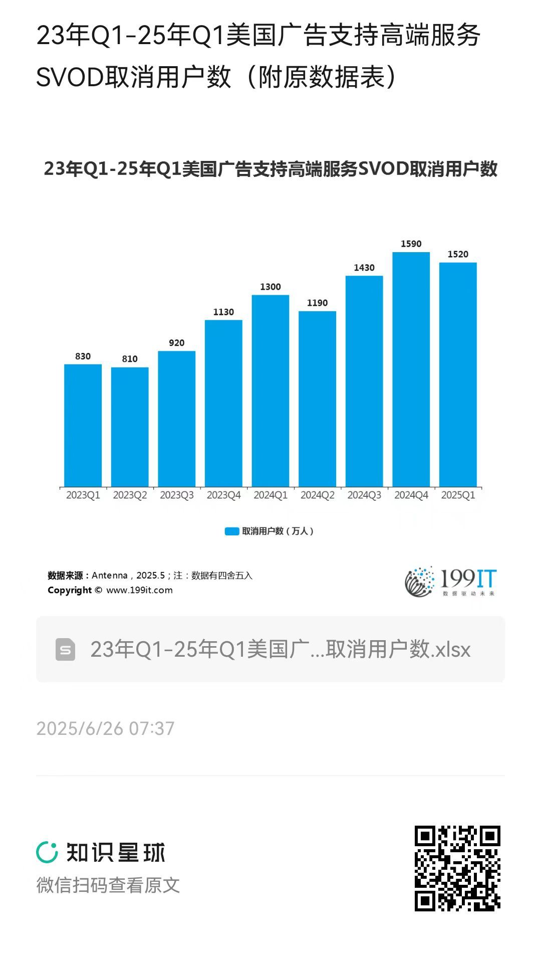 23年Q1-25年Q1美国广告支持高端服务SVOD取消用户数(附原数据表) ​​​