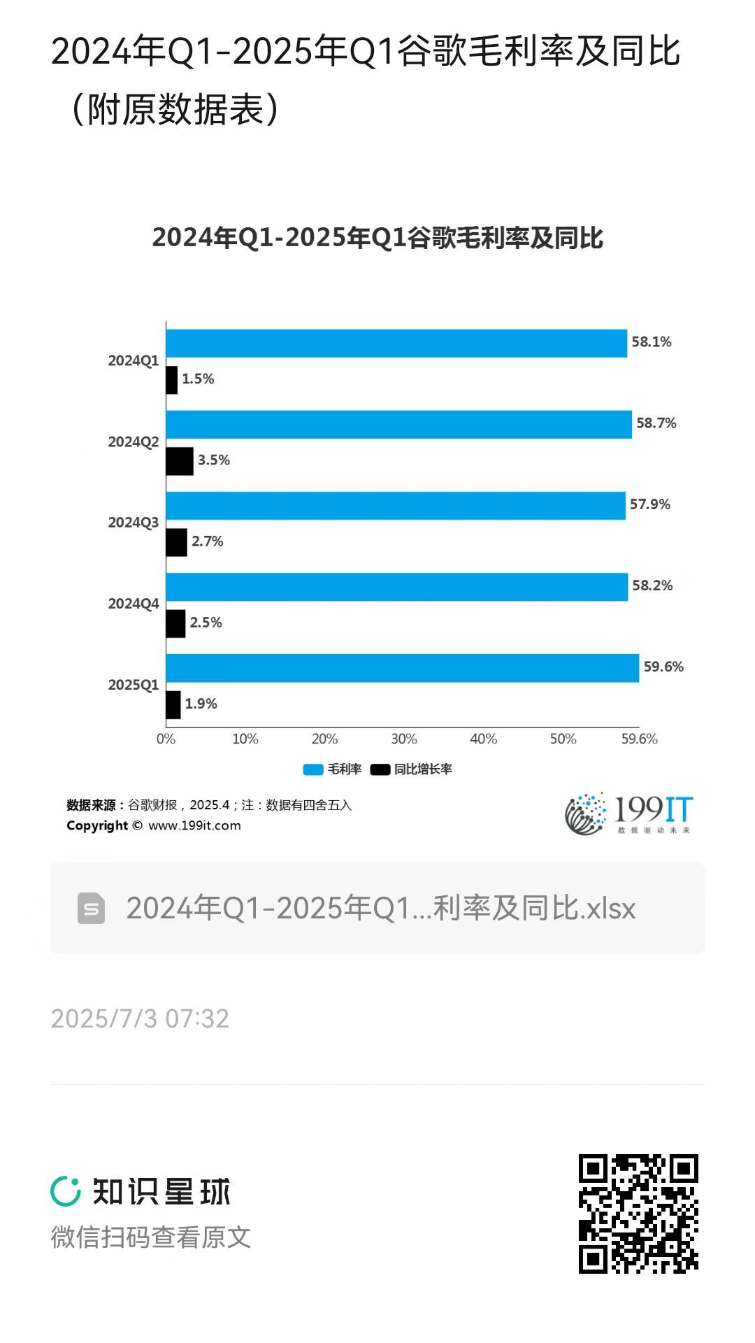 2024年Q1-2025年Q1谷歌毛利率及同比(附原数据表) ​​​
