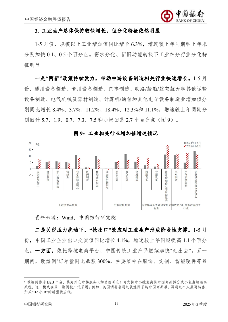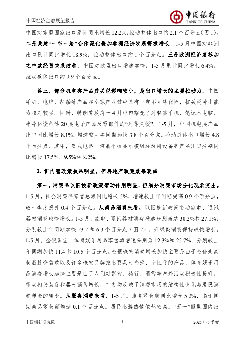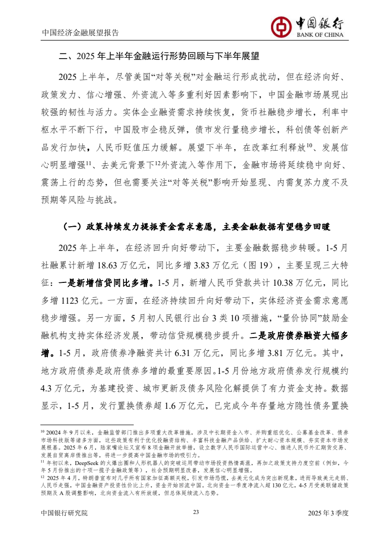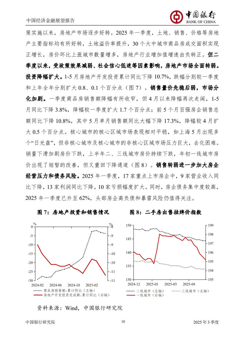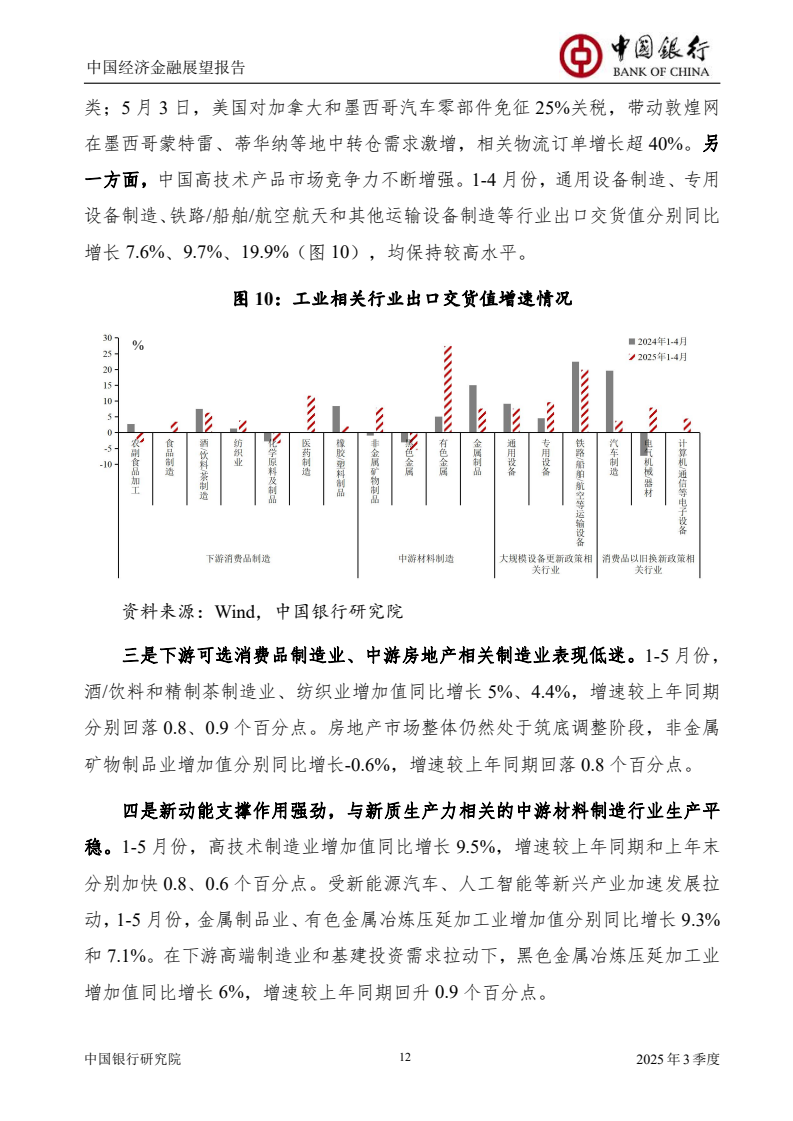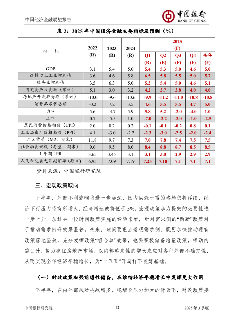 2025年上半年,面对急剧变化的外部环境,中国加紧实施更加积极有为的逆周期调控政策,内需表现较为稳定,出口好于预期,工业生产较快增长,经济总体平稳运行,预计上半年 GDP 增长5.4%左右。其中,受外部冲击、房地产市场再度转弱等因素影响,二季度经济景气度有所回落,预计GDP增长5.3%左右,增速较一季度回落0.1个百分点左右。