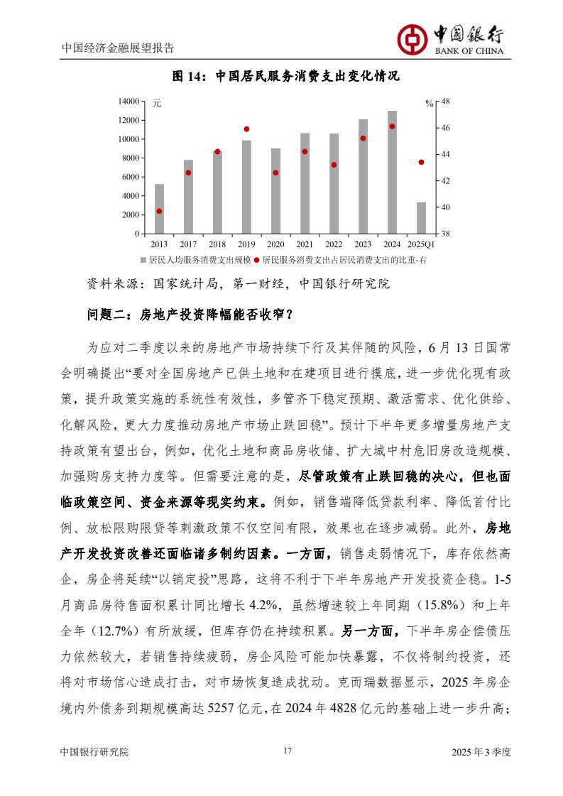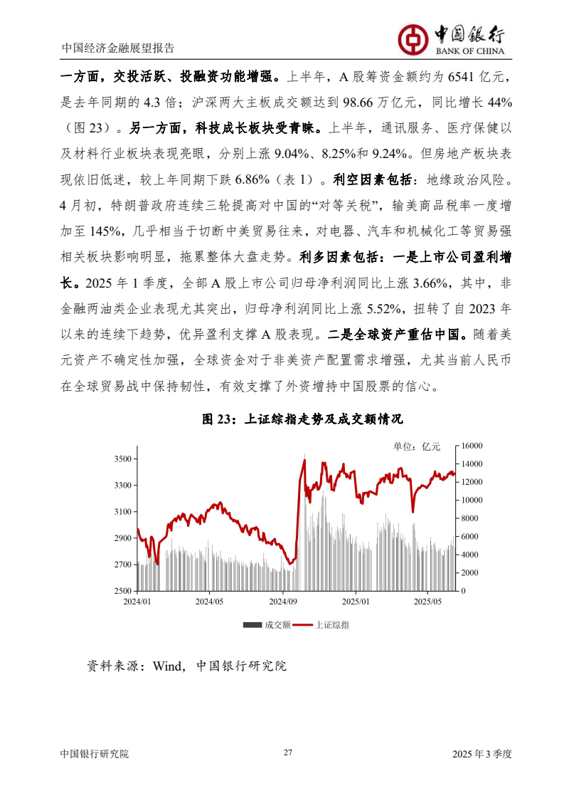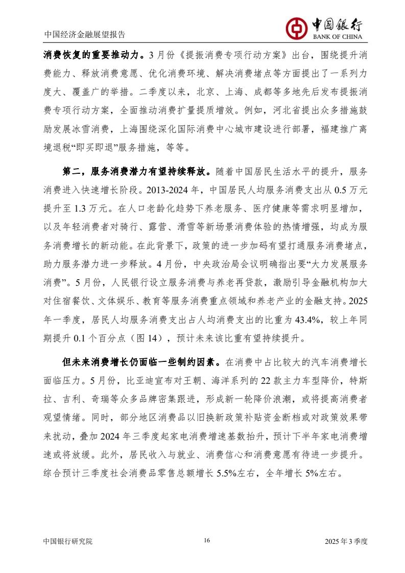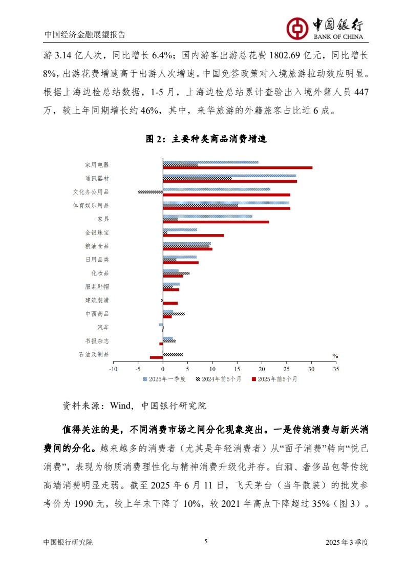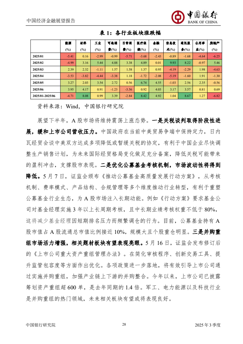 2025年上半年,面对急剧变化的外部环境,中国加紧实施更加积极有为的逆周期调控政策,内需表现较为稳定,出口好于预期,工业生产较快增长,经济总体平稳运行,预计上半年 GDP 增长5.4%左右。其中,受外部冲击、房地产市场再度转弱等因素影响,二季度经济景气度有所回落,预计GDP增长5.3%左右,增速较一季度回落0.1个百分点左右。