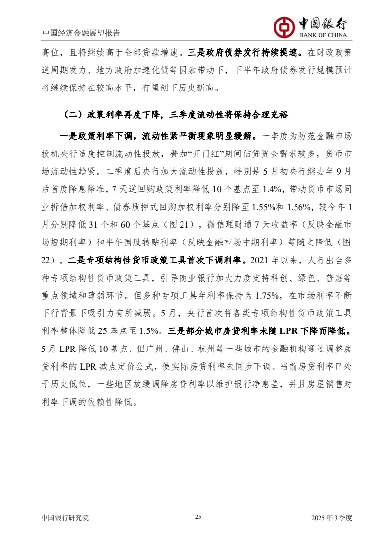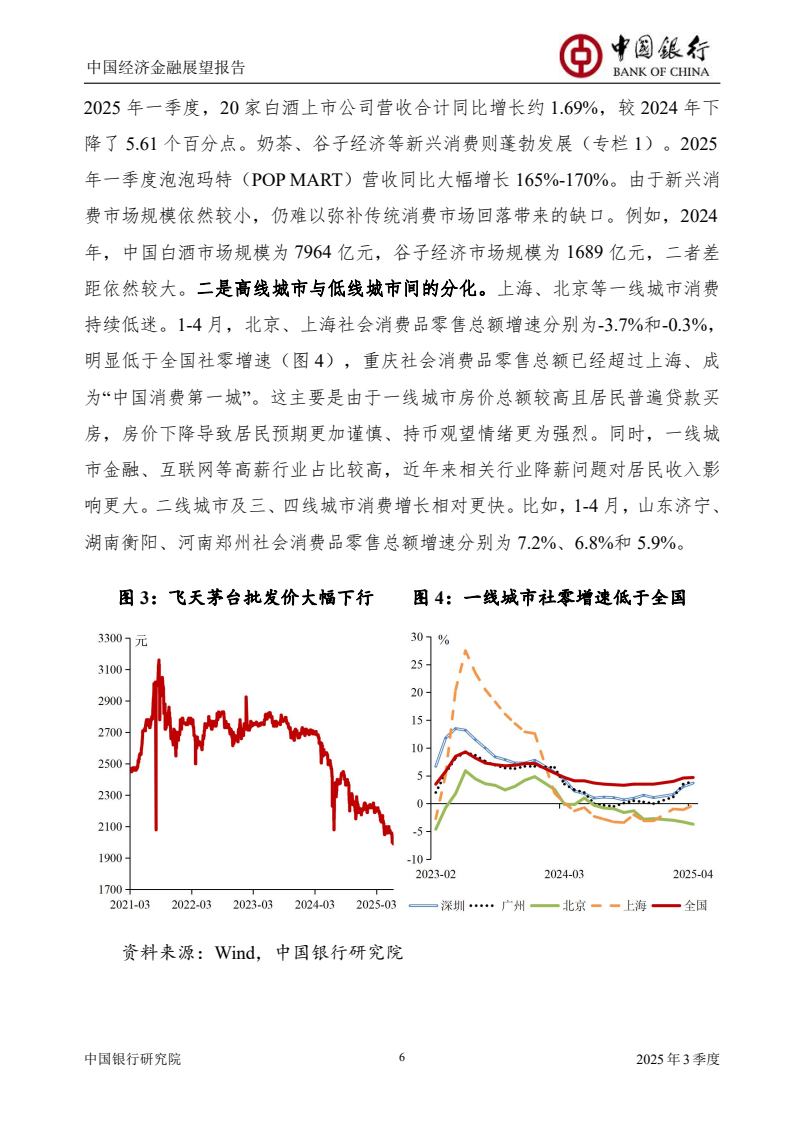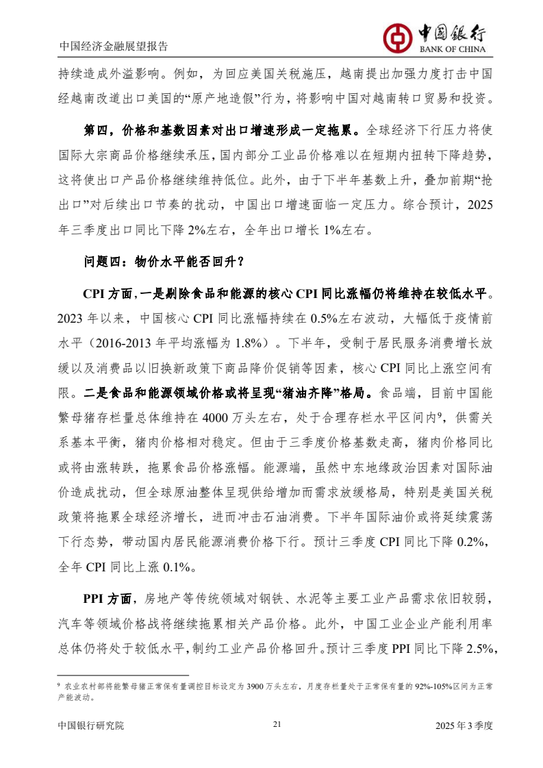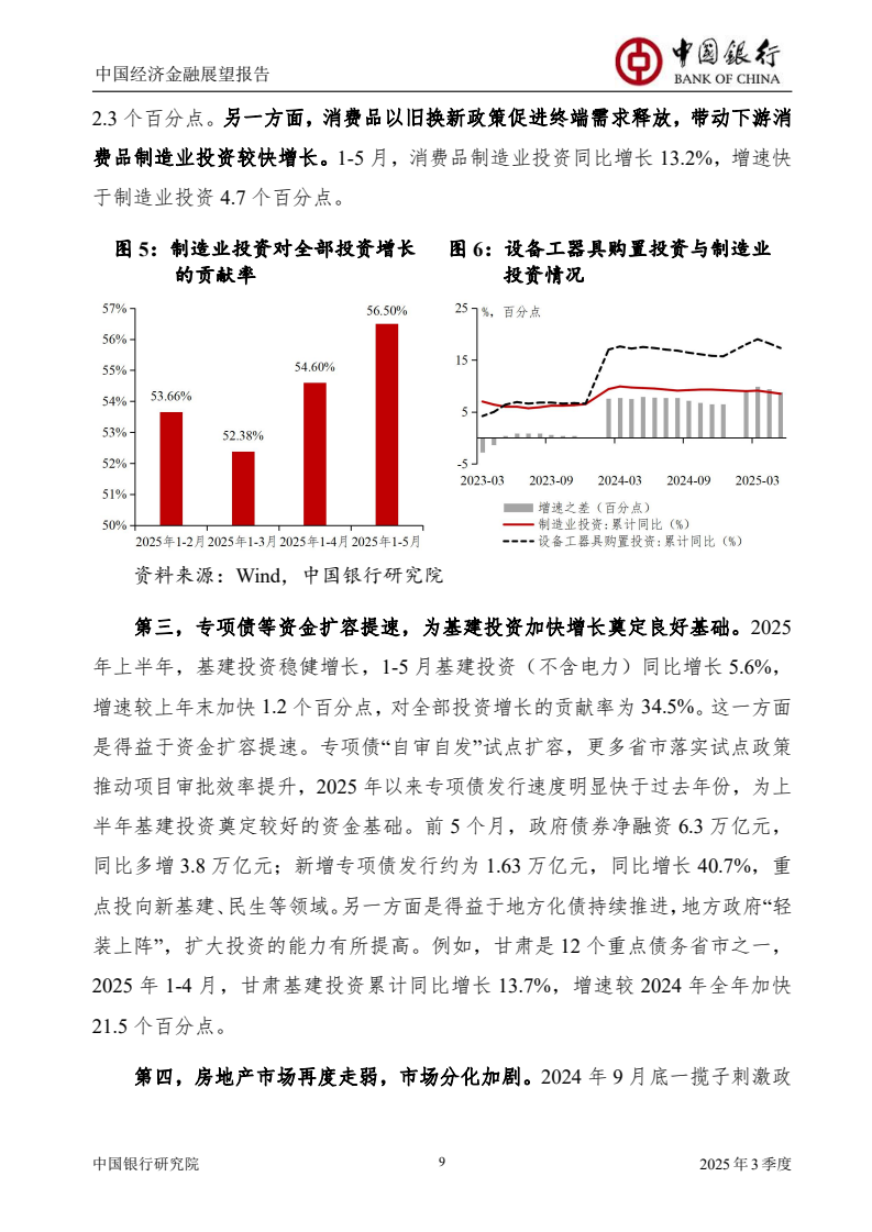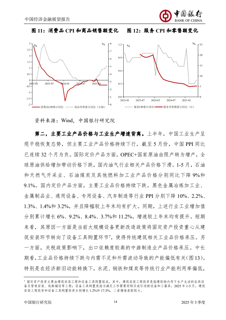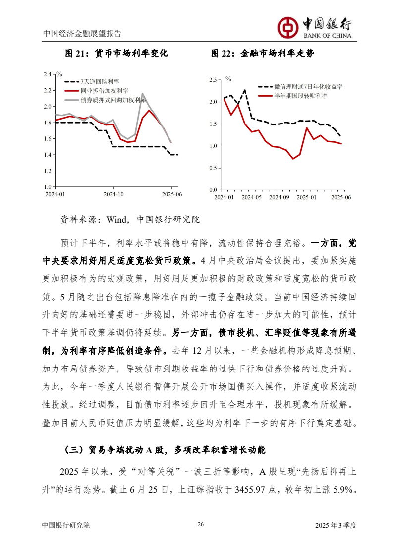 2025年上半年,面对急剧变化的外部环境,中国加紧实施更加积极有为的逆周期调控政策,内需表现较为稳定,出口好于预期,工业生产较快增长,经济总体平稳运行,预计上半年 GDP 增长5.4%左右。其中,受外部冲击、房地产市场再度转弱等因素影响,二季度经济景气度有所回落,预计GDP增长5.3%左右,增速较一季度回落0.1个百分点左右。