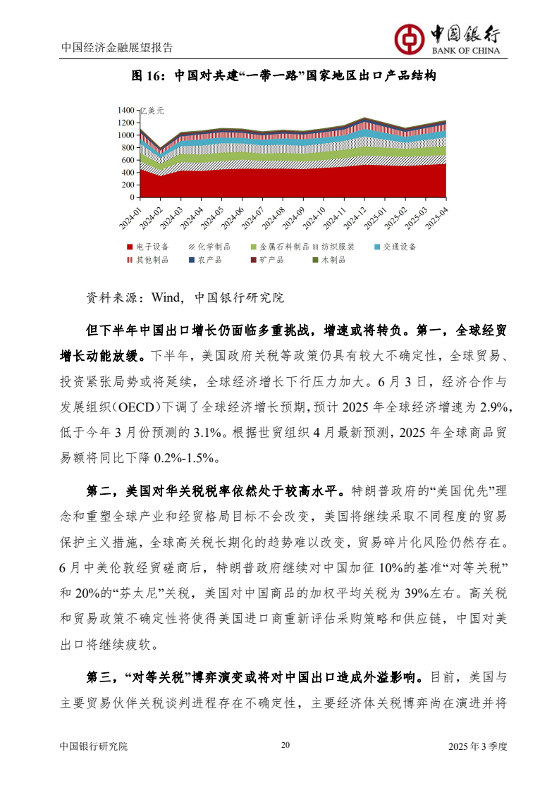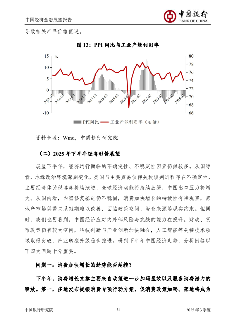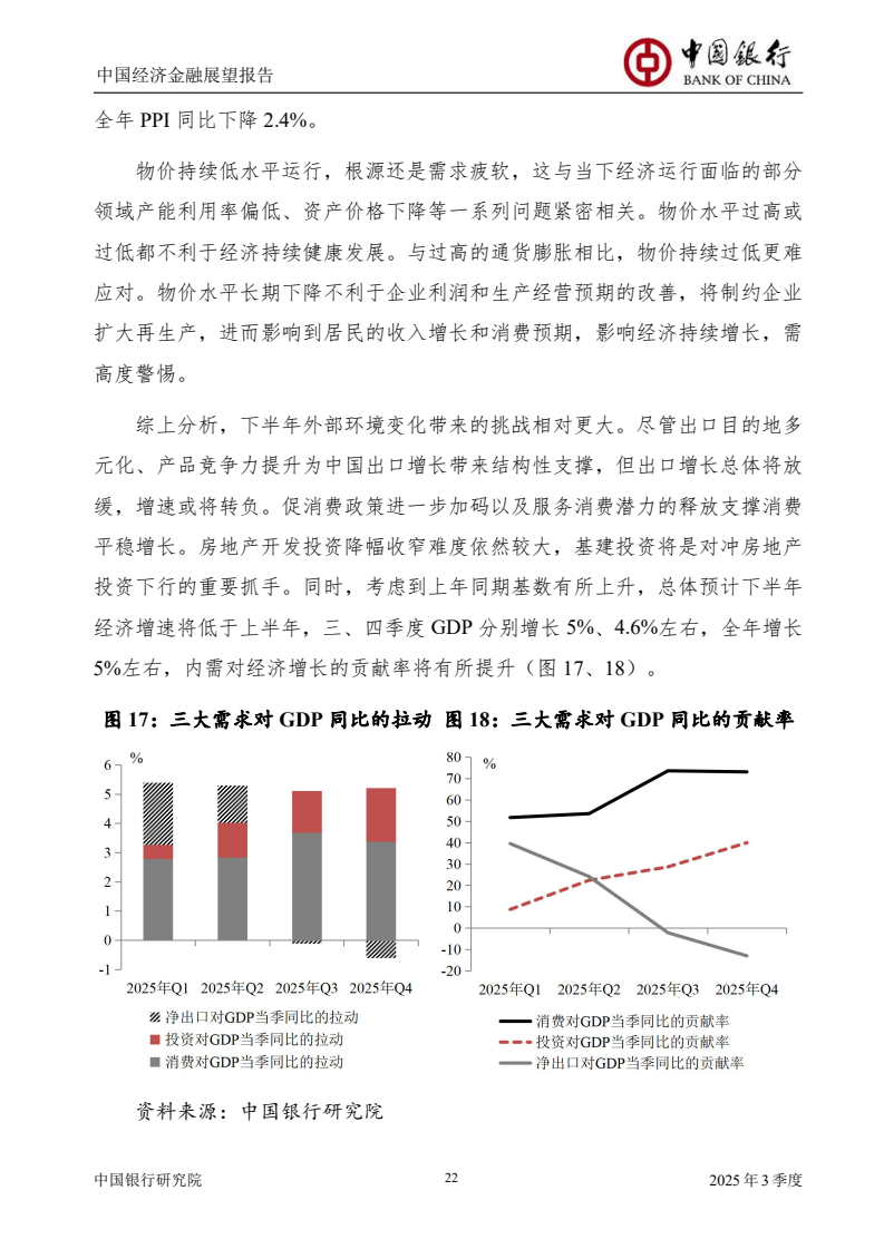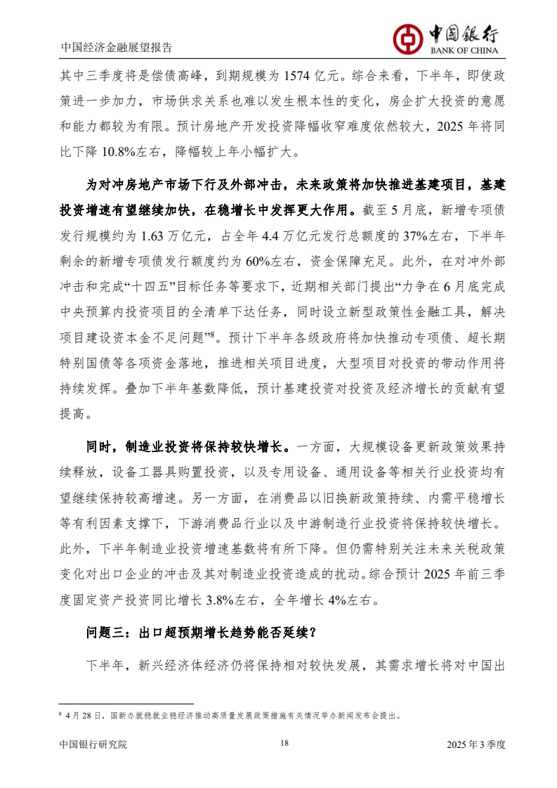 展望下半年,经济运行面临的不确定性、不稳定性因素仍然较多,尤其是美国关税政策仍存在较大不确定性,出口增长面临较大压力。预计下半年经济增速将低于上半年,三、四季度 GDP 分别增长5%、4.6%左右,全年增长5%左右。