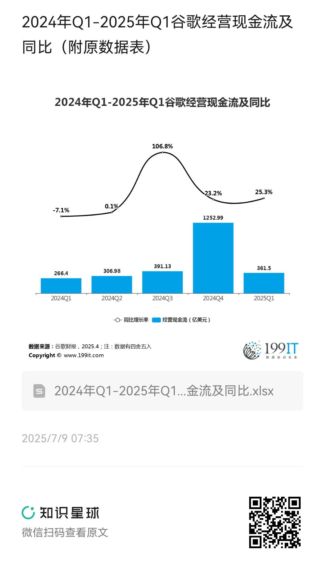 2024年Q1-2025年Q1谷歌经营现金流及同比(附原数据表) ​​​