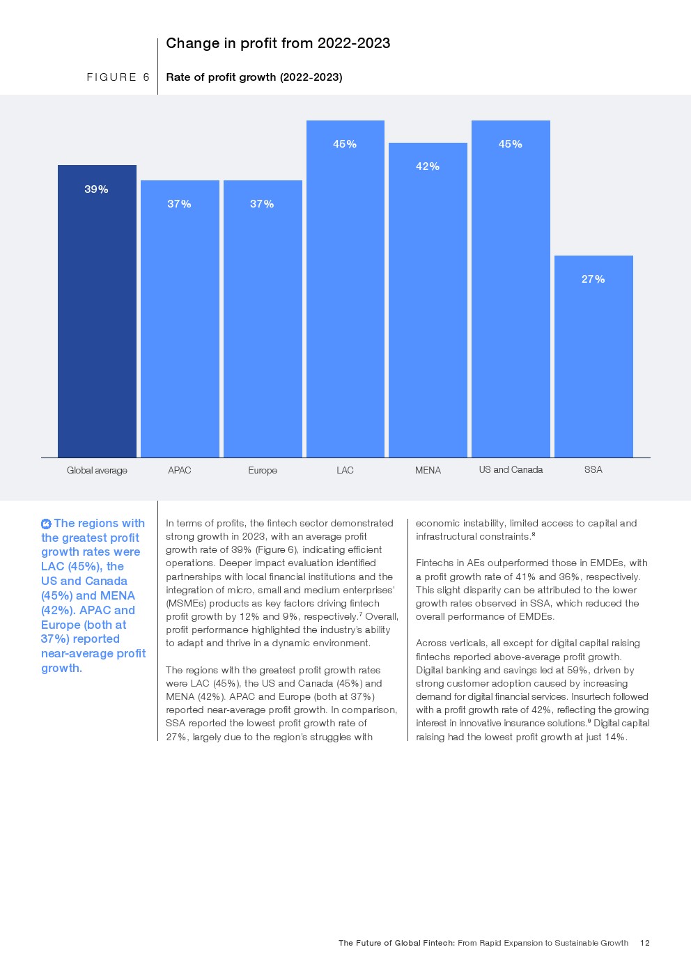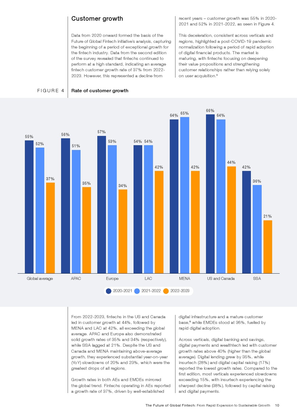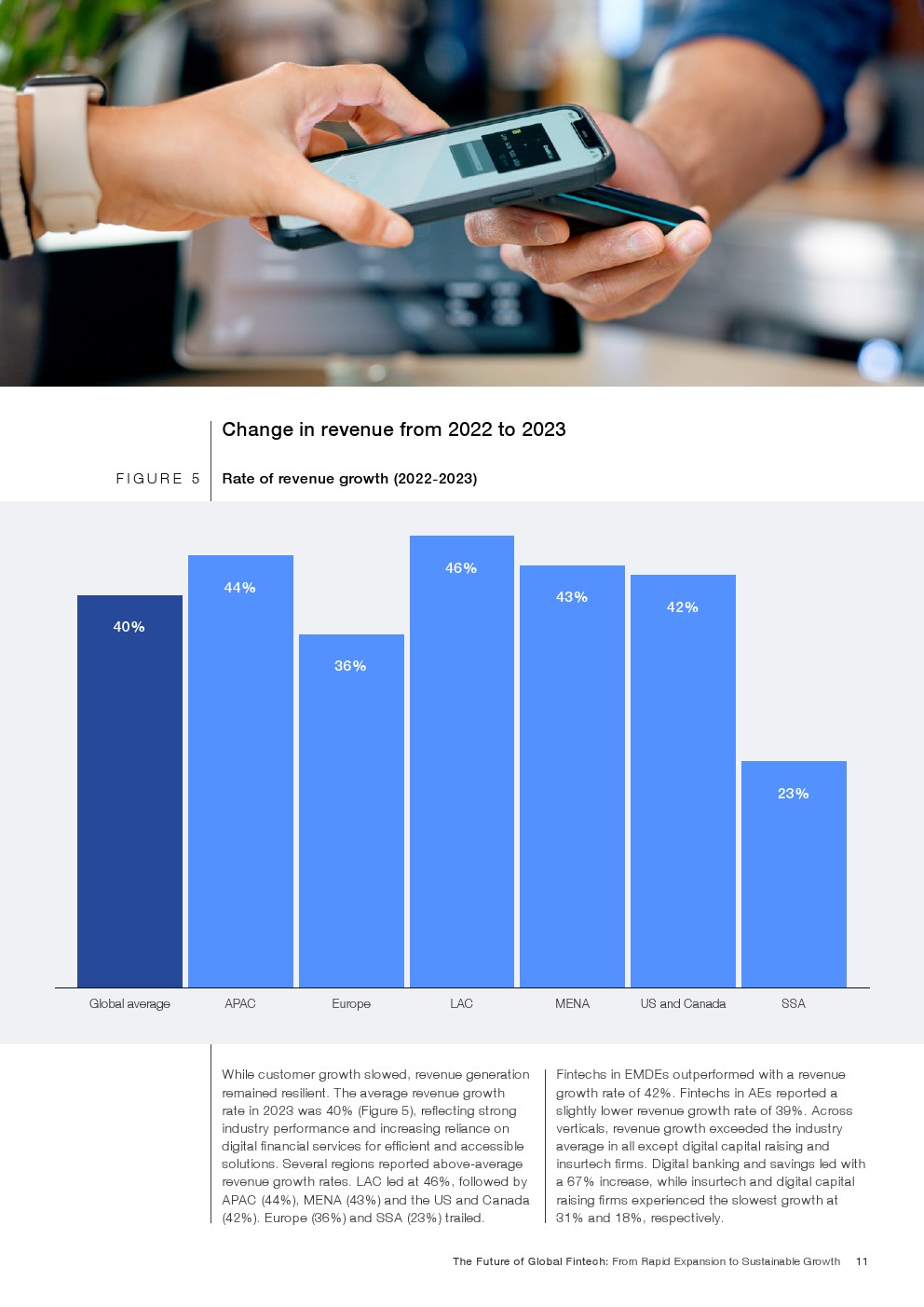 全球金融科技行业在向更可持续增长阶段过渡的过程中保持稳健。尽管增速较新冠疫情激增期有所放缓,但行业仍保持积极的绩效指标。2022-2023年的平均客户增长率为37%,低于2020-2021年的55%,反映出行业在疫情驱动的数字化加速后趋于自然市场正常化。值得欣慰的是,收入增长强劲,达40%,利润增长也表现良好,为39%。