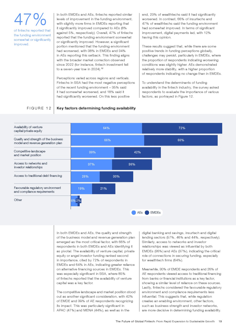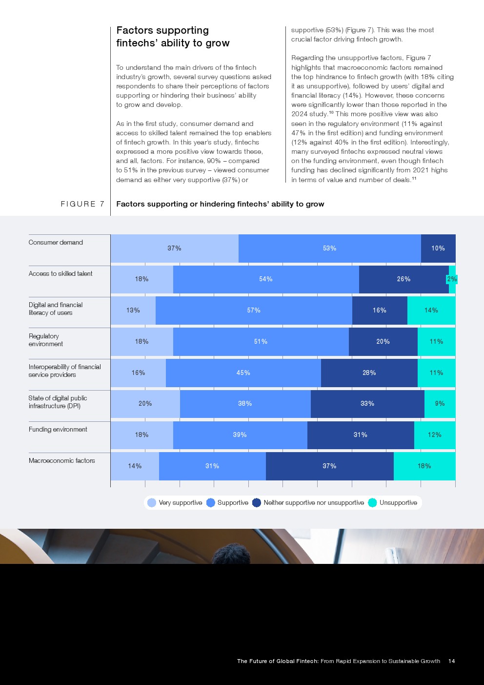 宏观经济因素仍是金融科技增长的主要挑战,但已有所改善。18%的受访者认为宏观经济因素不利于增长,37%认为其影响中性。而在上一项研究中,56%的受访者视其为阻碍。同样,对融资环境的看法也有所改善,31%的金融科技公司持中立态度,仅12%认为其构成阻碍(上一研究中这一比例为40%)。