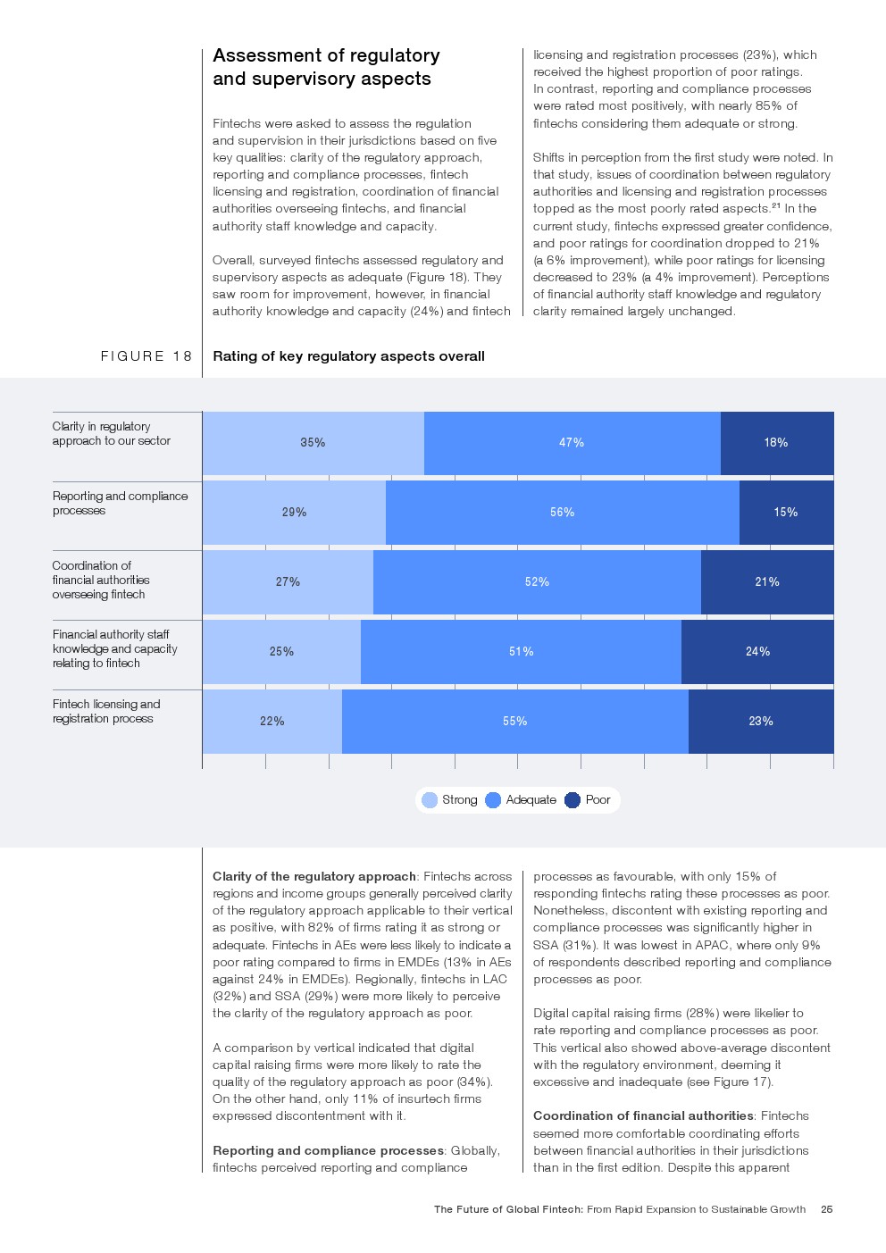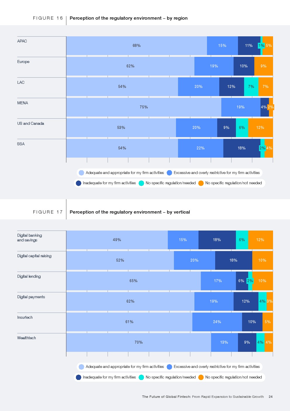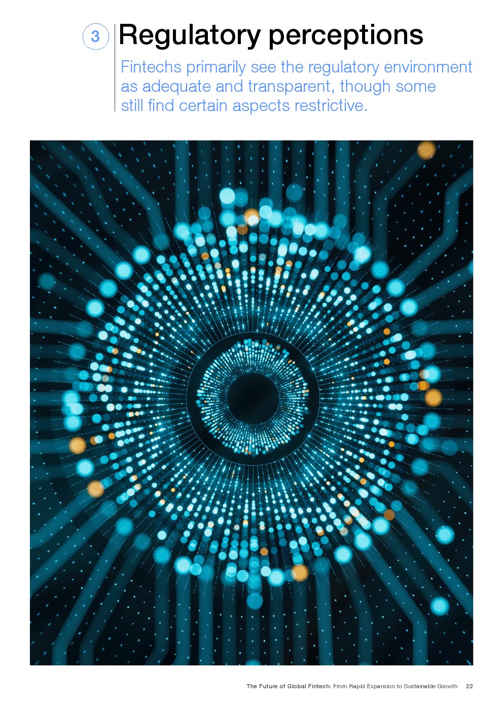 金融科技公司普遍对监管环境及监管机构采取的措施表示满意。62%的金融科技公司认为其业务所在地区的监管足以支持运营,35%认为监管方法清晰明确。挑战仍存在于金融监管机构的知识与能力、监管协调性以及许可和注册流程等方面。