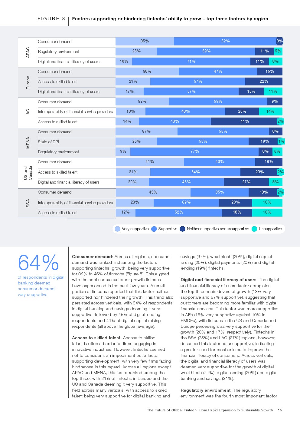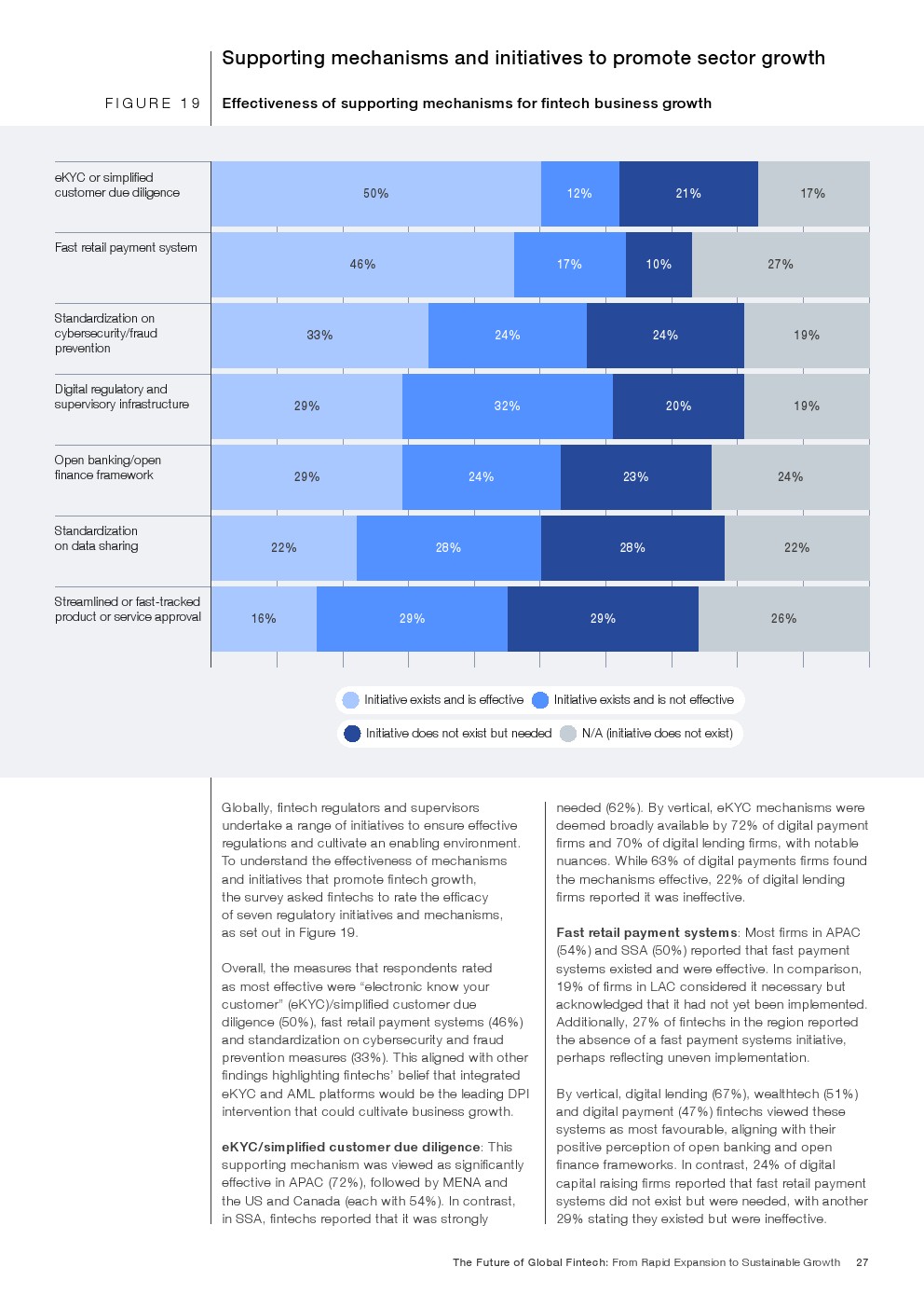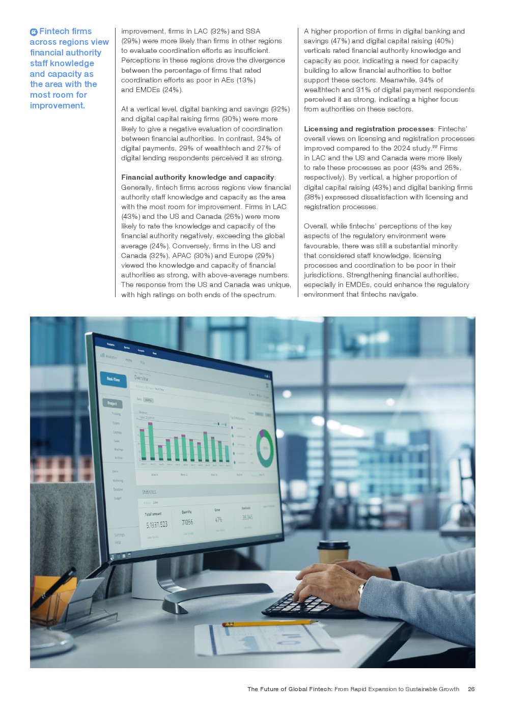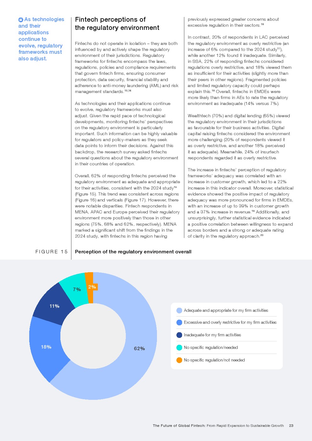 金融科技公司普遍对监管环境及监管机构采取的措施表示满意。62%的金融科技公司认为其业务所在地区的监管足以支持运营,35%认为监管方法清晰明确。挑战仍存在于金融监管机构的知识与能力、监管协调性以及许可和注册流程等方面。