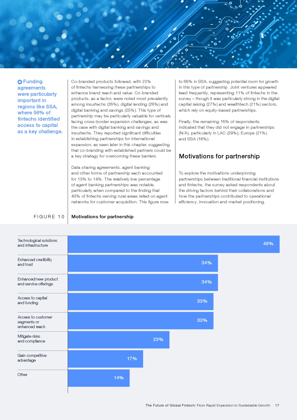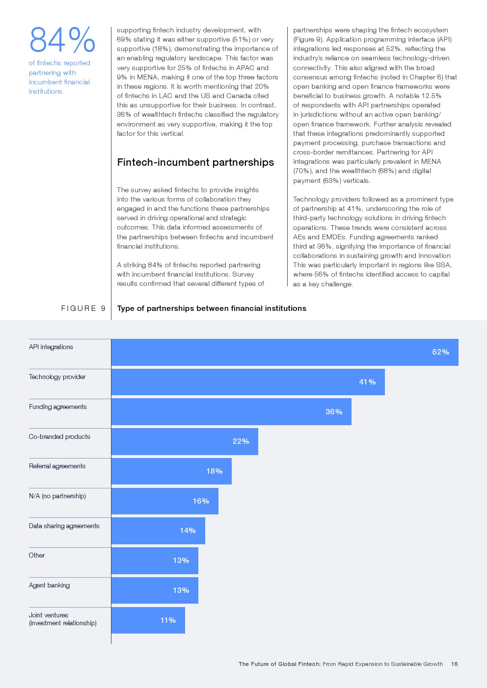 合作在金融科技战略中至关重要。84%的受访金融科技公司与传统金融机构合作,最常见的方式包括API集成(52%)、技术提供商合作(41%)和融资协议(36%)。技术解决方案和基础设施(48%)是合作的主要动因,其次是增强可信度与信任(34%)以及产品与服务创新(34%)。