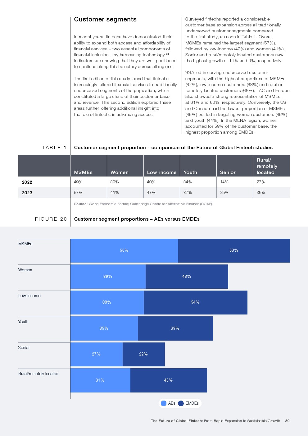金融普惠仍是金融科技价值主张的核心,传统服务不足的群体占客户基础的很大比例。金融科技公司报告显示,微型、小型和中型企业(MSMEs)占其客户的57%,低收入人群占47%,女性占41%。这些群体尤其在新兴市场和发展中经济体(EMDEs)贡献了可观的收入,表明普惠性能够支持盈利能力。