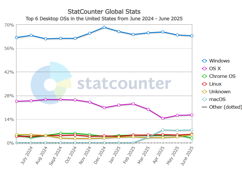根据StatCounter 2025年6月的全球统计数据,Windows仍然是绝对的领导者,占据了63.2%的市场份额,但其市场份额一直在稳步下降,在过去十年中下降了近13个百分点。苹果的市场份额由OS X(16.57%)和macOS(7.72%)组成,两者合计占比近24%。“未知”操作系统类别占4.76%,而Chrome OS则占据了桌面生态系统的2.71%。