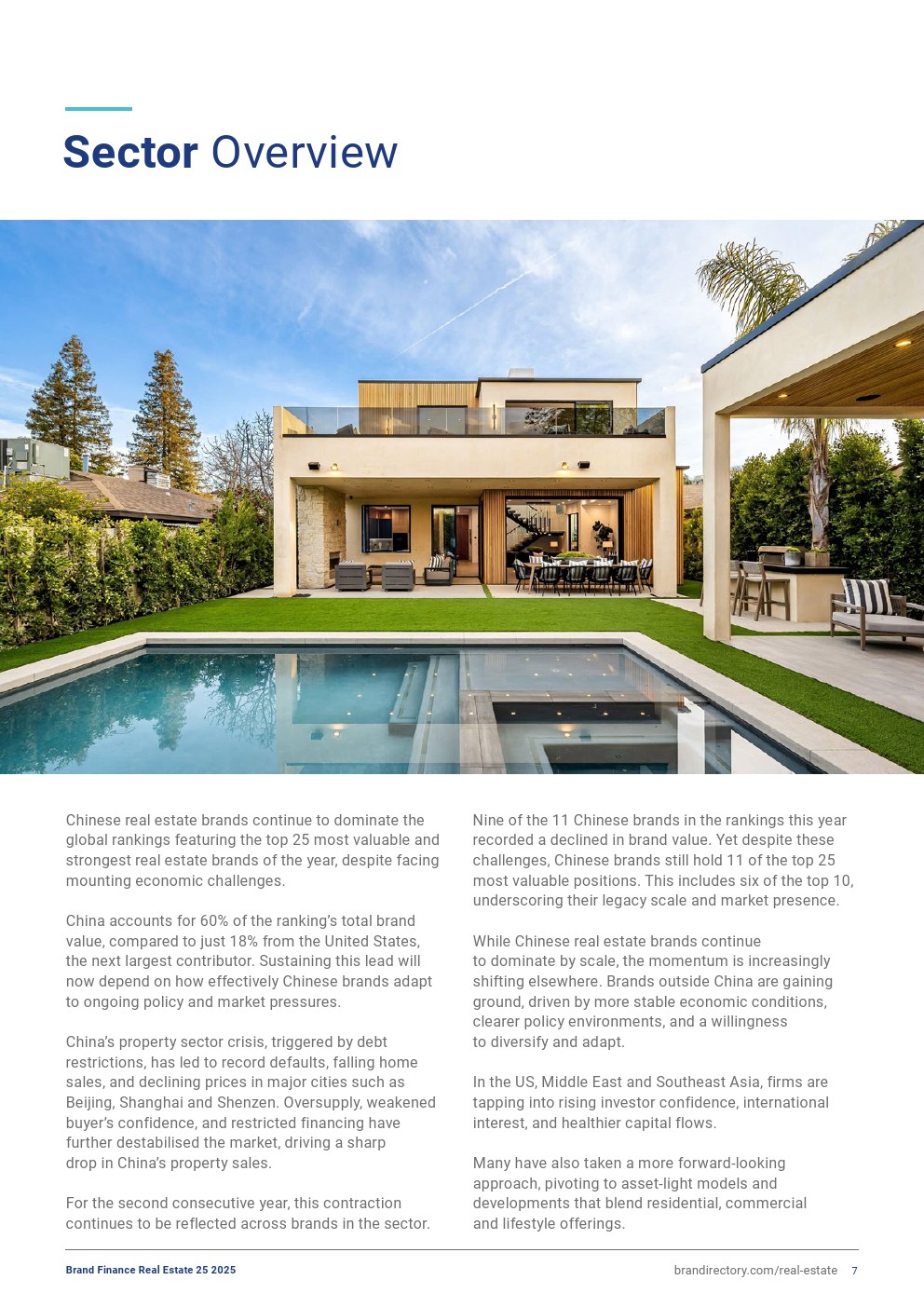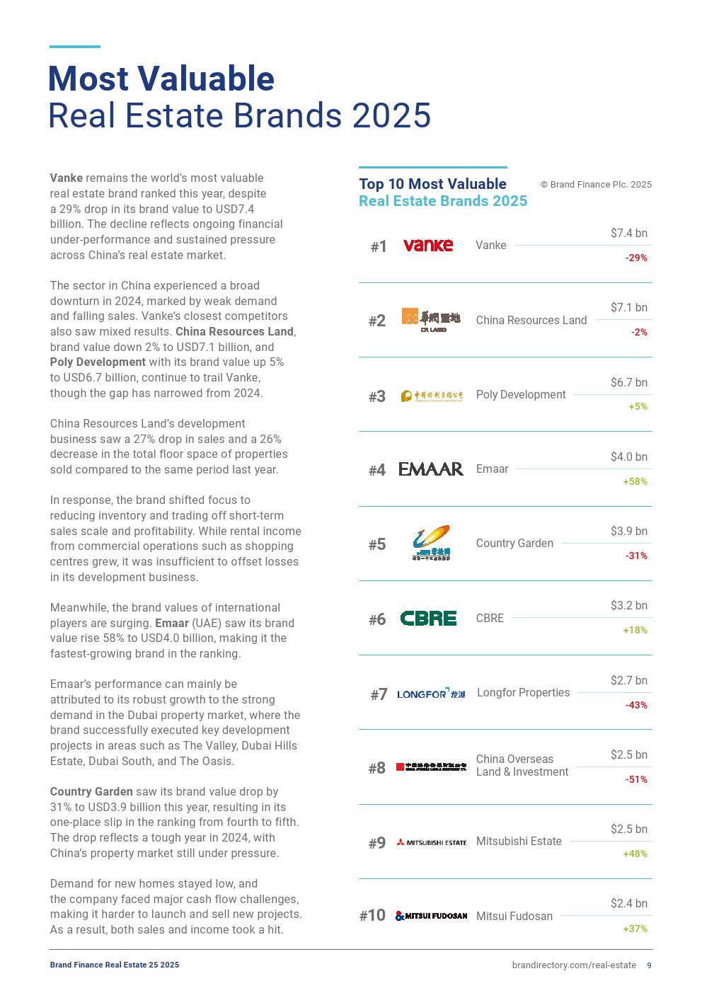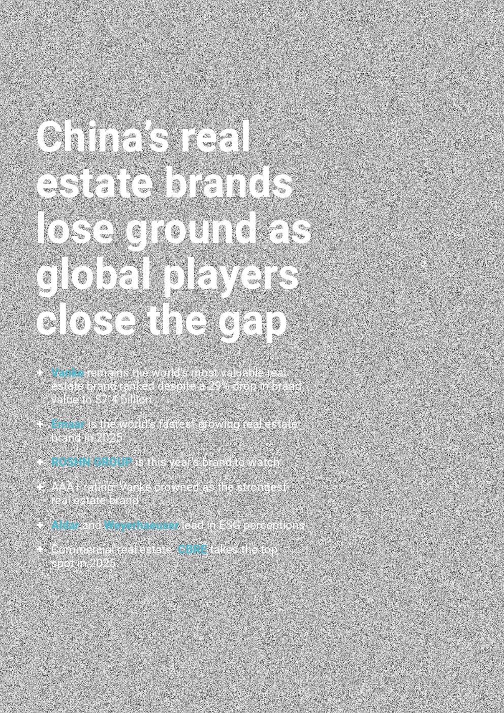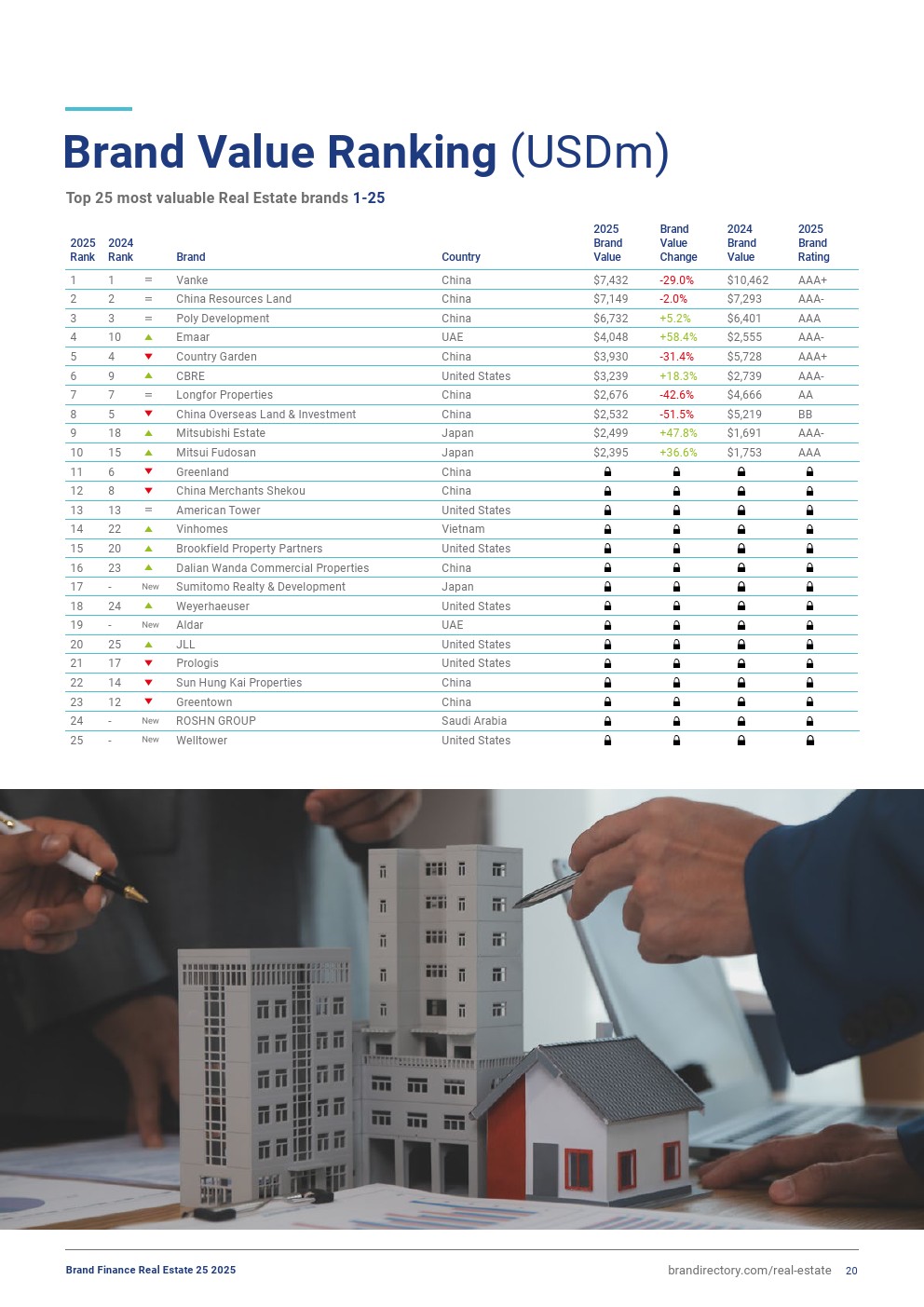 中国房地产品牌仍领跑全球25强,占品牌总价值的60%(美国仅占18%)。但政策限制、销量下滑及买家信心低迷等持续挑战重创该行业,多数中国品牌价值出现下跌。尽管如此,中国品牌仍占25强中的11席(其中6家进入前十)。与此同时,受益于更稳定的经济环境、投资者信心提升以及灵活的混合开发策略,海外品牌正逐步崛起。