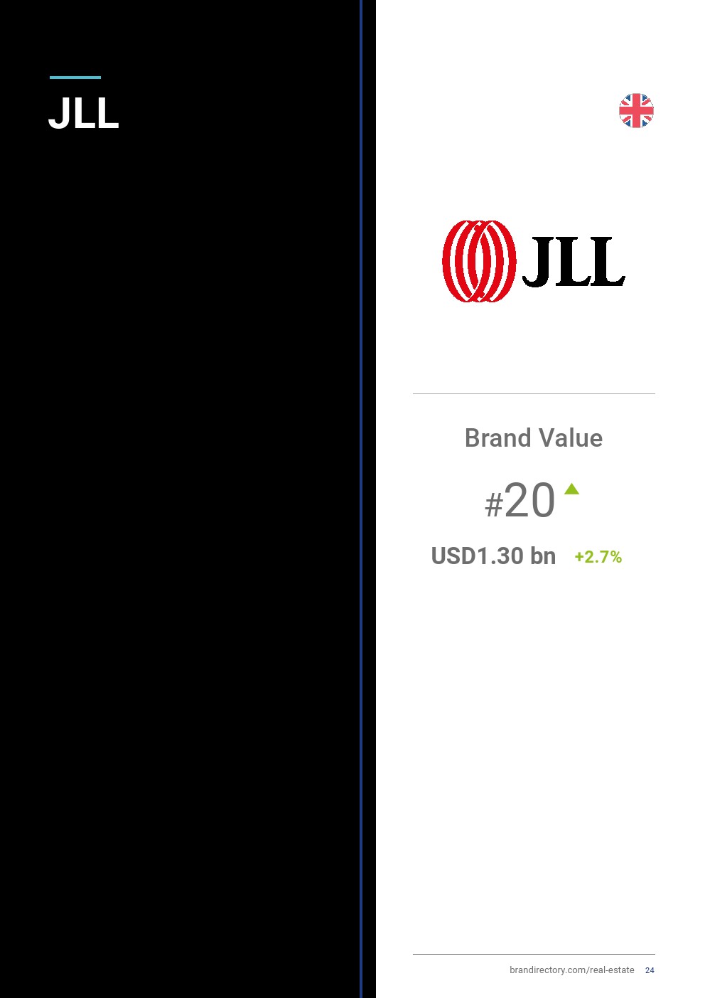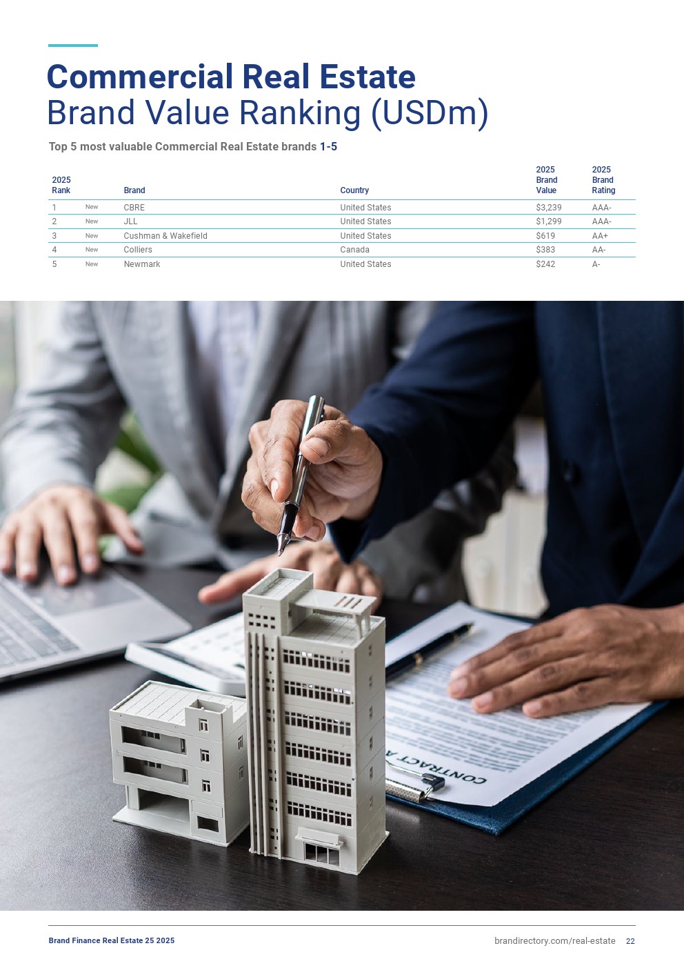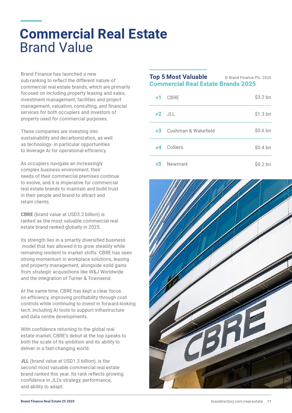 CBRE(品牌价值增长18%,达到32亿美元)现位列第六,排名较去年上升三位。作为美国唯一进入行业前十的品牌,CBRE的崛起源于其全方位稳健增长。从职场解决方案到房地产投资的多元化业务使其保持灵活性与韧性。