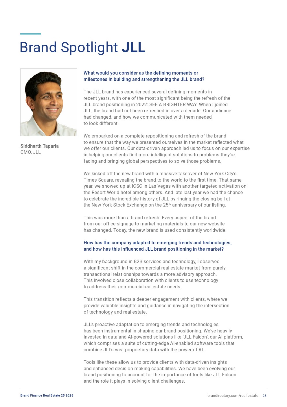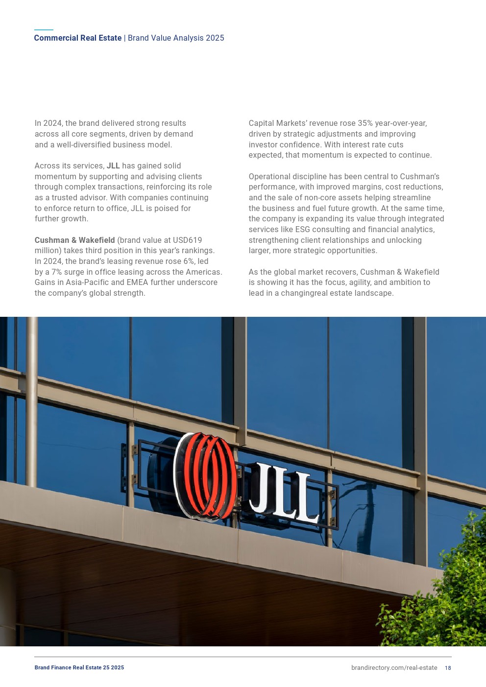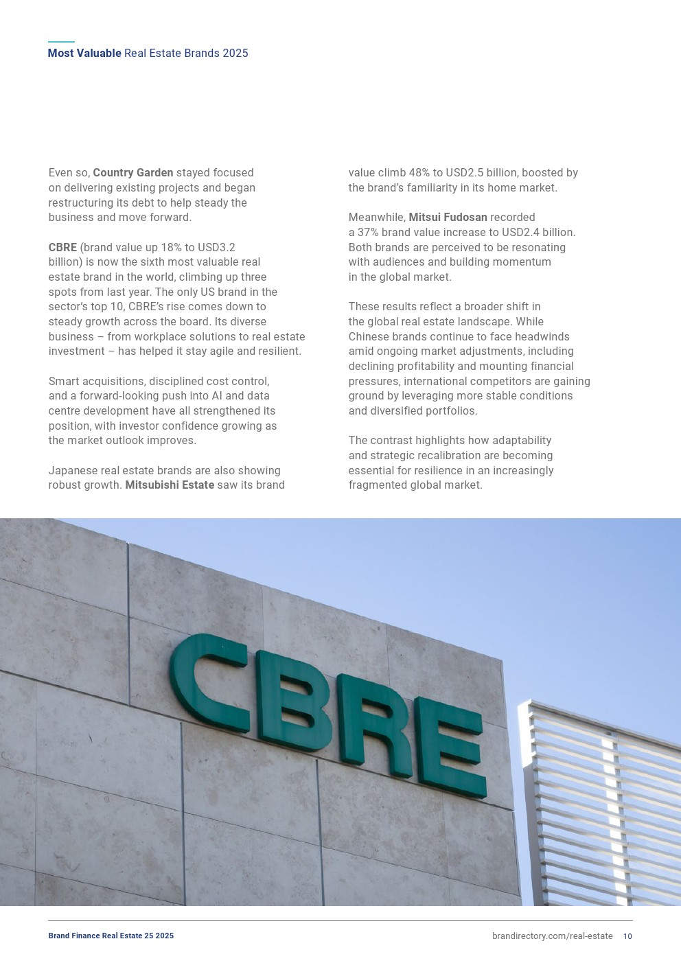 CBRE(品牌价值增长18%,达到32亿美元)现位列第六,排名较去年上升三位。作为美国唯一进入行业前十的品牌,CBRE的崛起源于其全方位稳健增长。从职场解决方案到房地产投资的多元化业务使其保持灵活性与韧性。