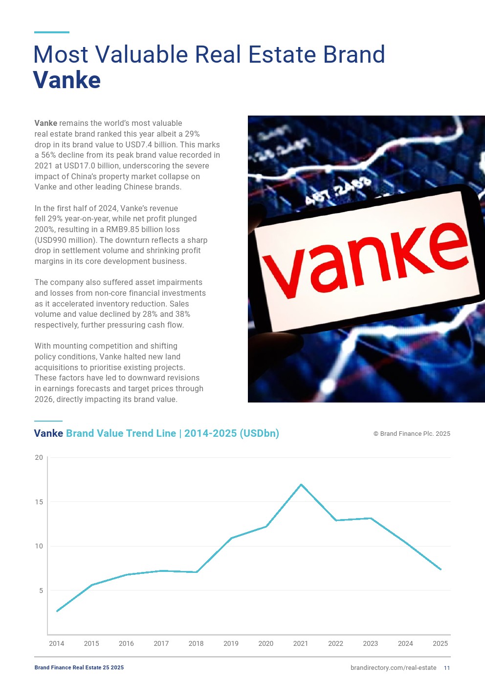 万科(品牌价值下降29%,达到74亿美元)仍是本年度最具价值房地产品牌。这一下滑折射出中国房地产市场持续面临的财务表现疲软与整体压力。