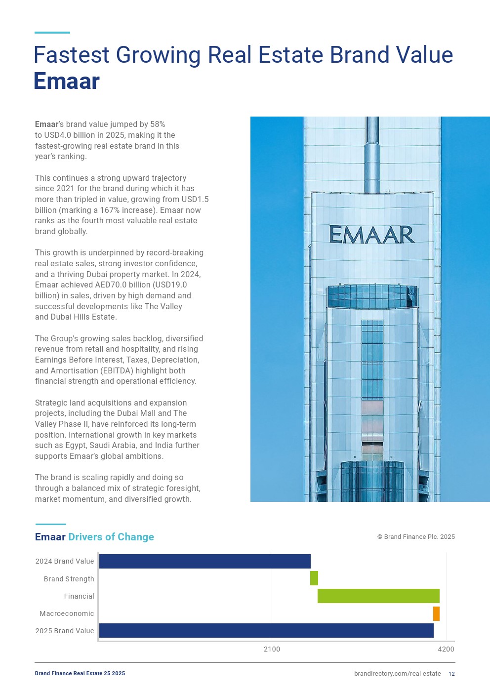 阿联酋Emaar(品牌价值增长58%,达到40亿美元)成为榜单增长最快品牌,其增长主要得益于迪拜房地产市场的强劲需求,该品牌在The Valley、迪拜山庄、迪拜南城及绿洲等区域成功推进重点开发项目。