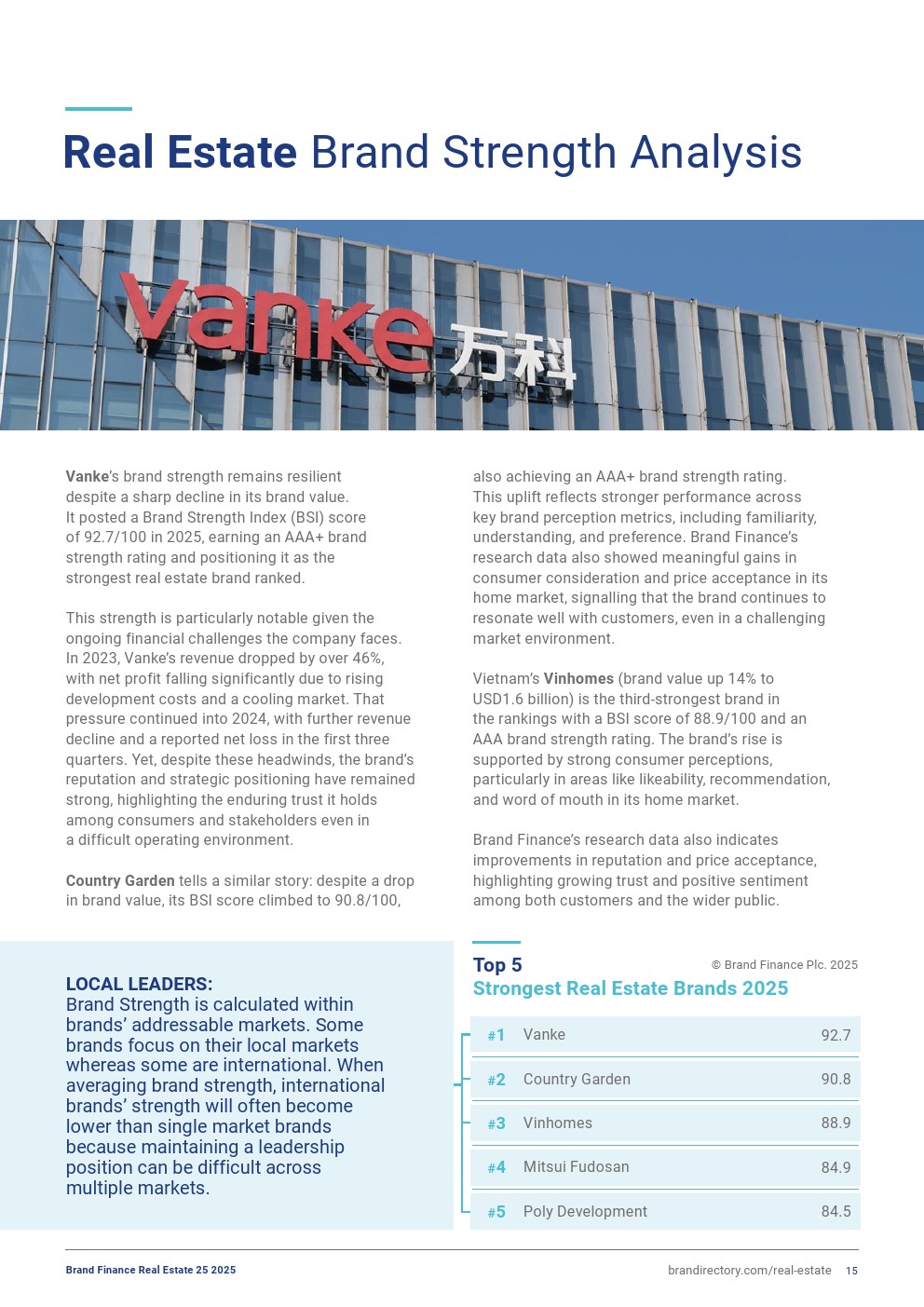 万科最接近的竞争对手表现分化:华润置地(品牌价值下降2%,达到71亿美元)与保利发展(品牌价值上升5%,达到67亿美元)仍落后于万科,但差距较2024年有所缩小。