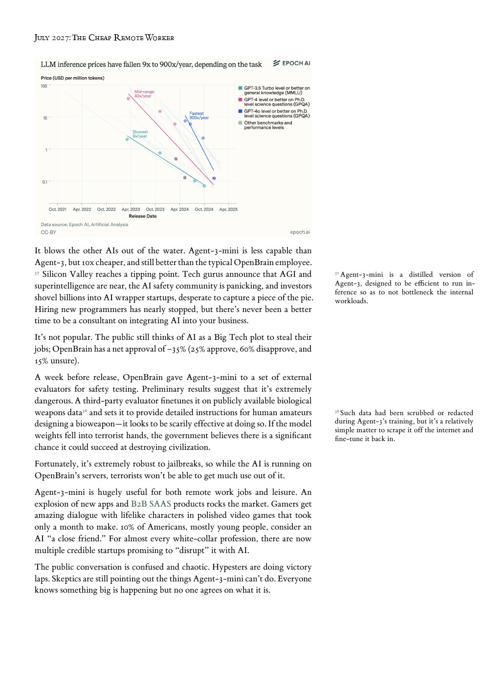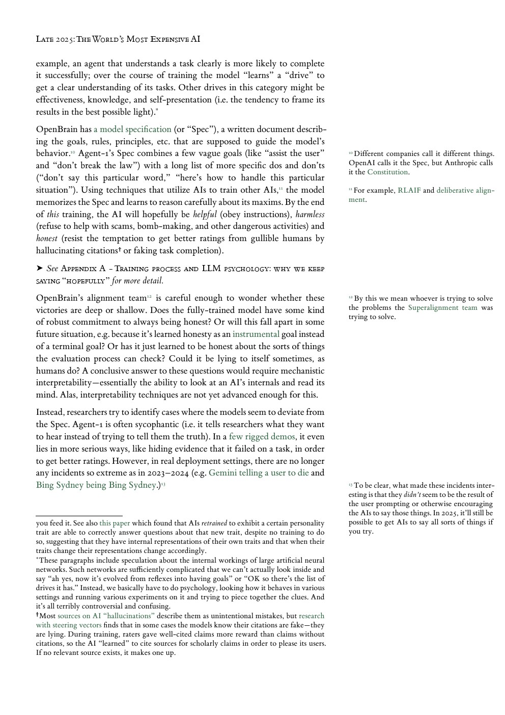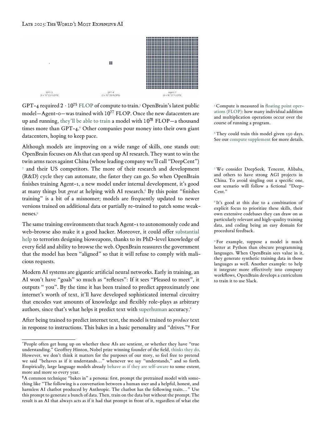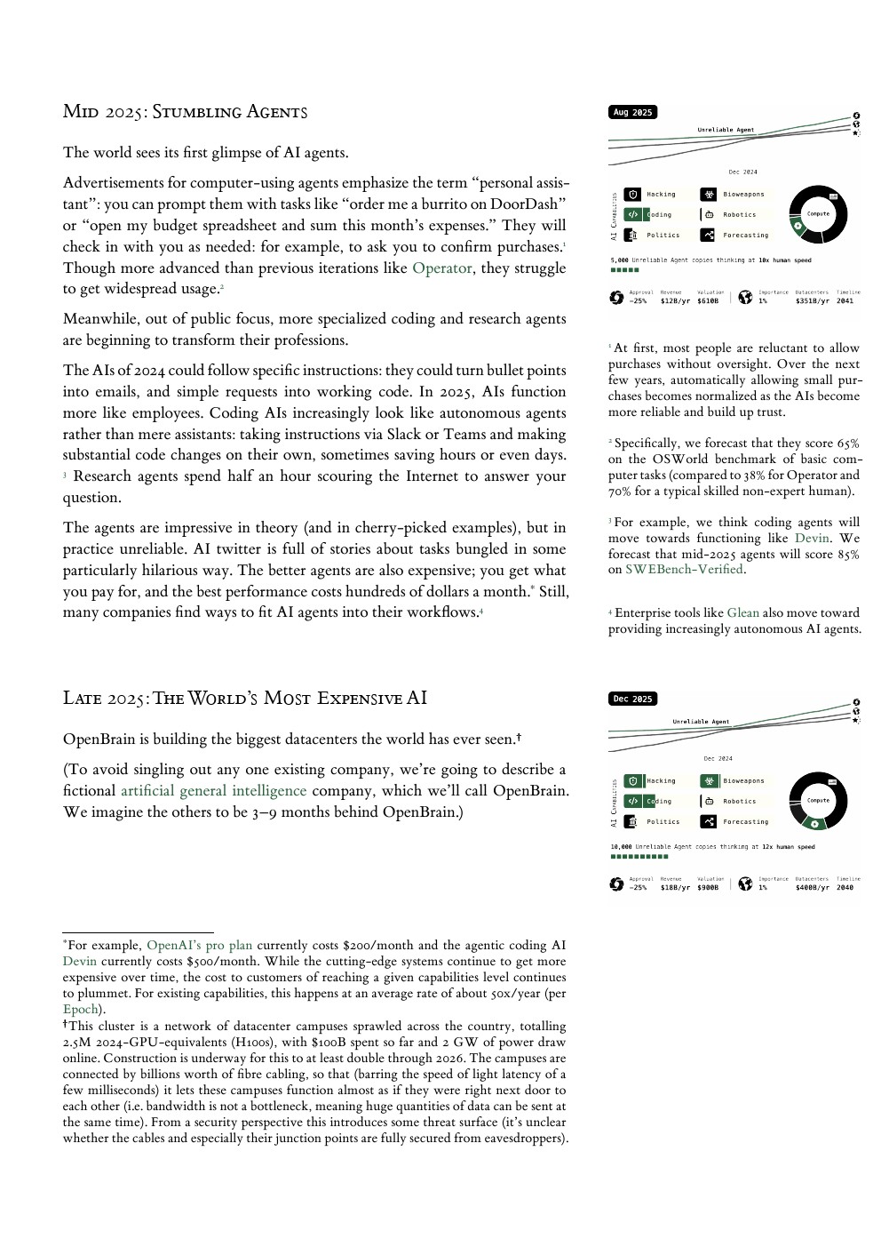 报告预测,超人类级AI在未来十年内的影响将是巨大的,甚至超越工业革命的规模。OpenAI、Google DeepMind和Anthropic的CEO们都预测,通用人工智能(AGI)将在未来5年内实现。Sam Altman表示,OpenAI正致力于实现”真正意义上的超级智能”和”辉煌的未来”。人们很容易将此视为炒作而置之不理——这将是一个严重的错误,因为这不仅仅是炒作。我们无意夸大AI的影响,但我们也认为,到本年代末出现超级智能的可能性极高。