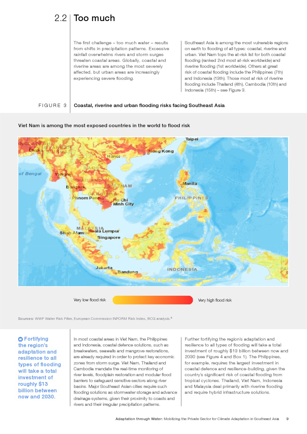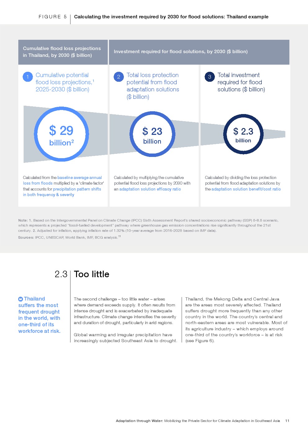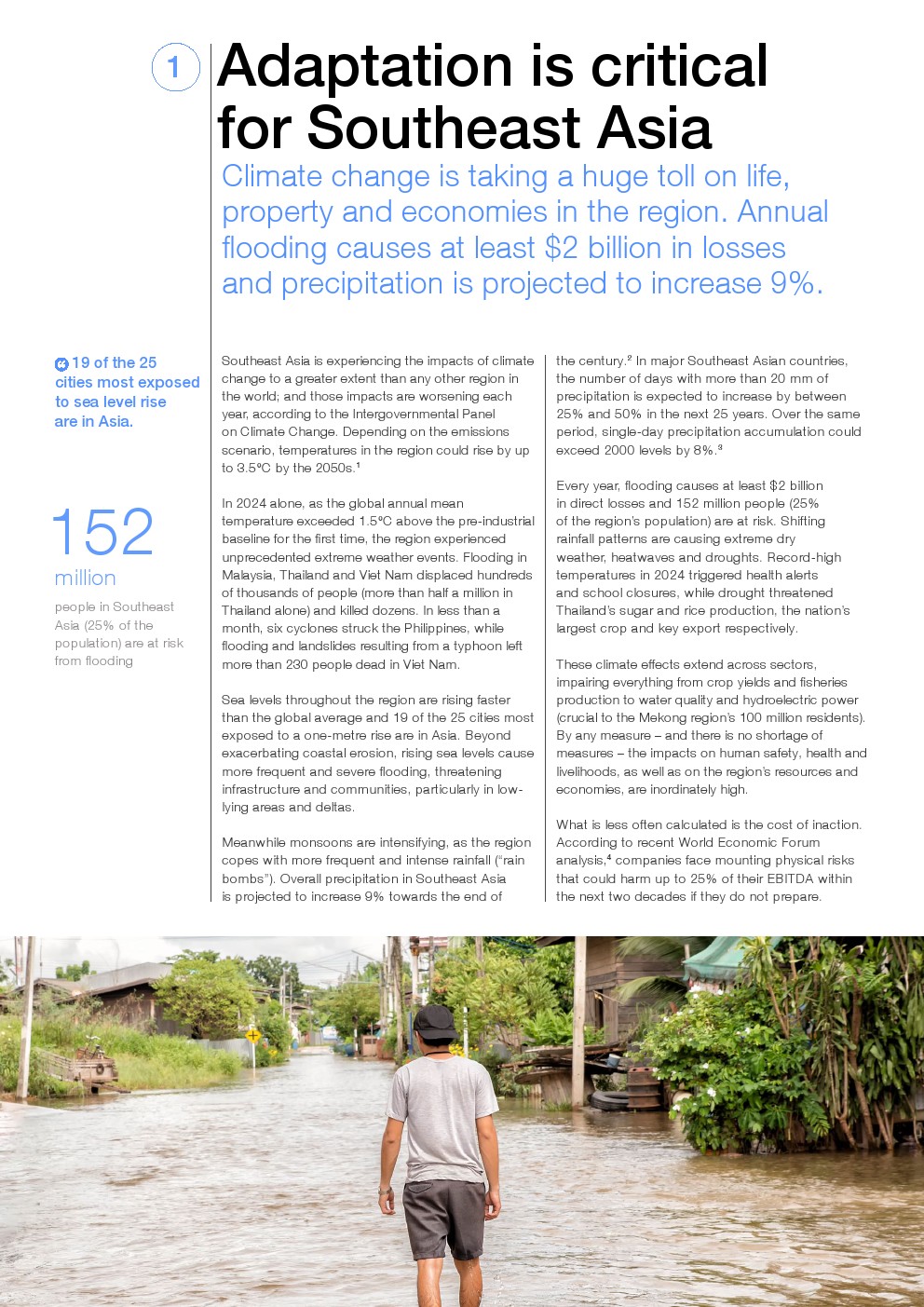东南亚已是全球最易受极端天气影响的地区之一:例如,越南是全球洪水风险暴露度最高的国家之一,而泰国的干旱频率高于其他任何地区。总体而言,东南亚国家可能因气候变化损失18%-25%的GDP。该地区亟需加快应对气候变化影响的准备,但目前这些努力仍未得到足够重视和支持。