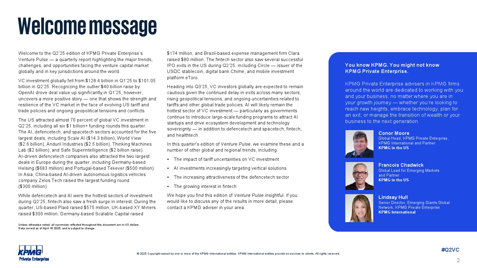 毕马威发布了“2025年第二季度风险投资报告”。全球风险投资从2025年第一季度的1284亿美元下降至第二季度的1010.5亿美元。尽管出现下滑,考虑到第一季度包含了OpenAI单笔400亿美元的异常融资,在持续的地缘政治冲突、贸易紧张和宏观经济不确定性背景下,2025年第二季度仍是一个相对强劲的季度。