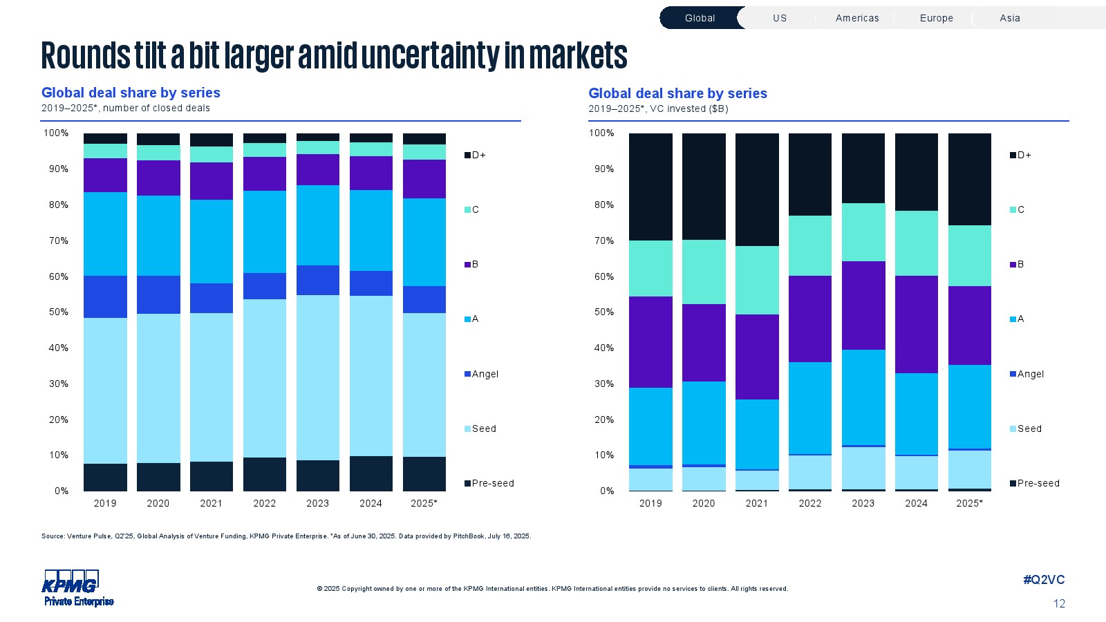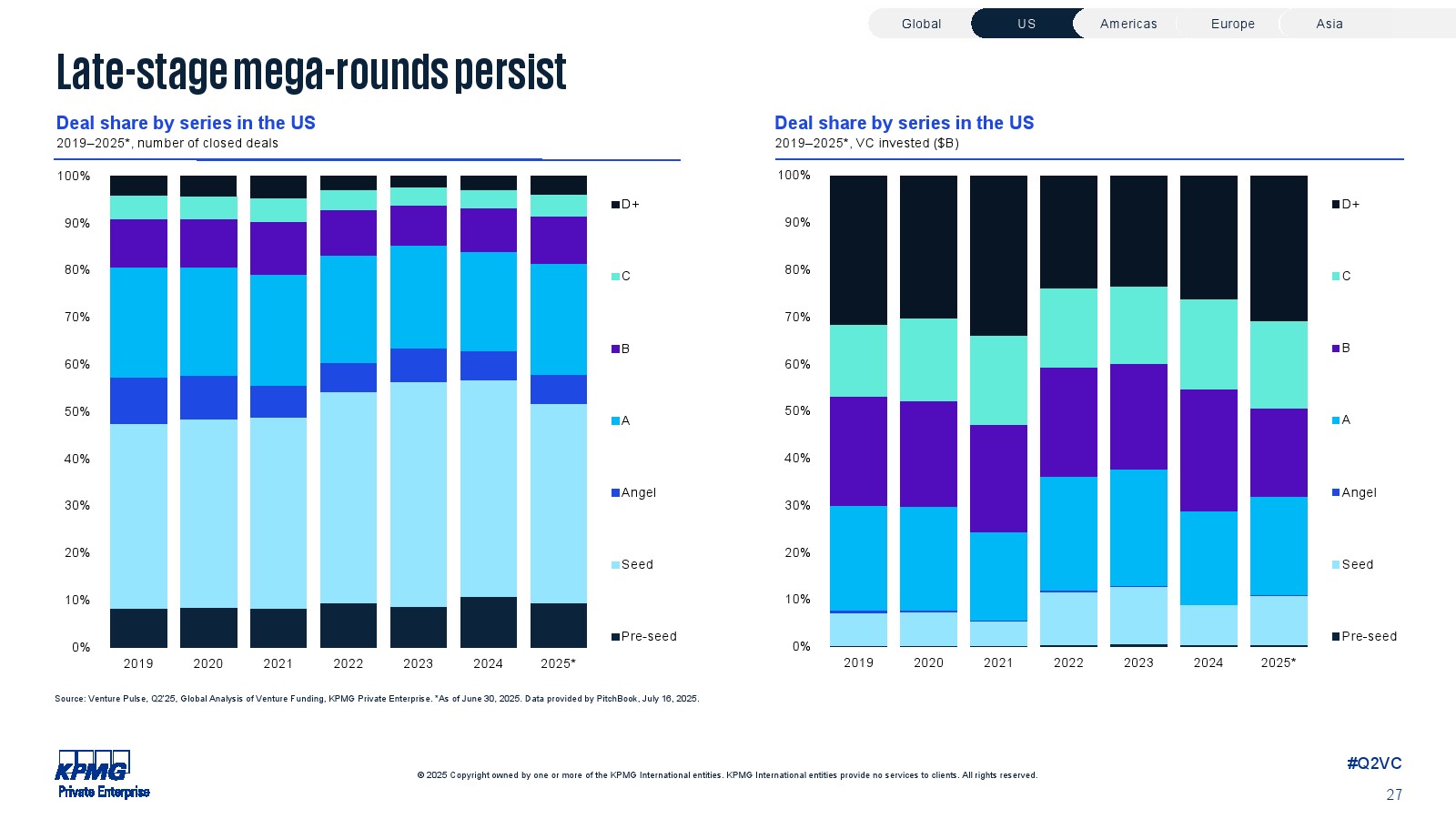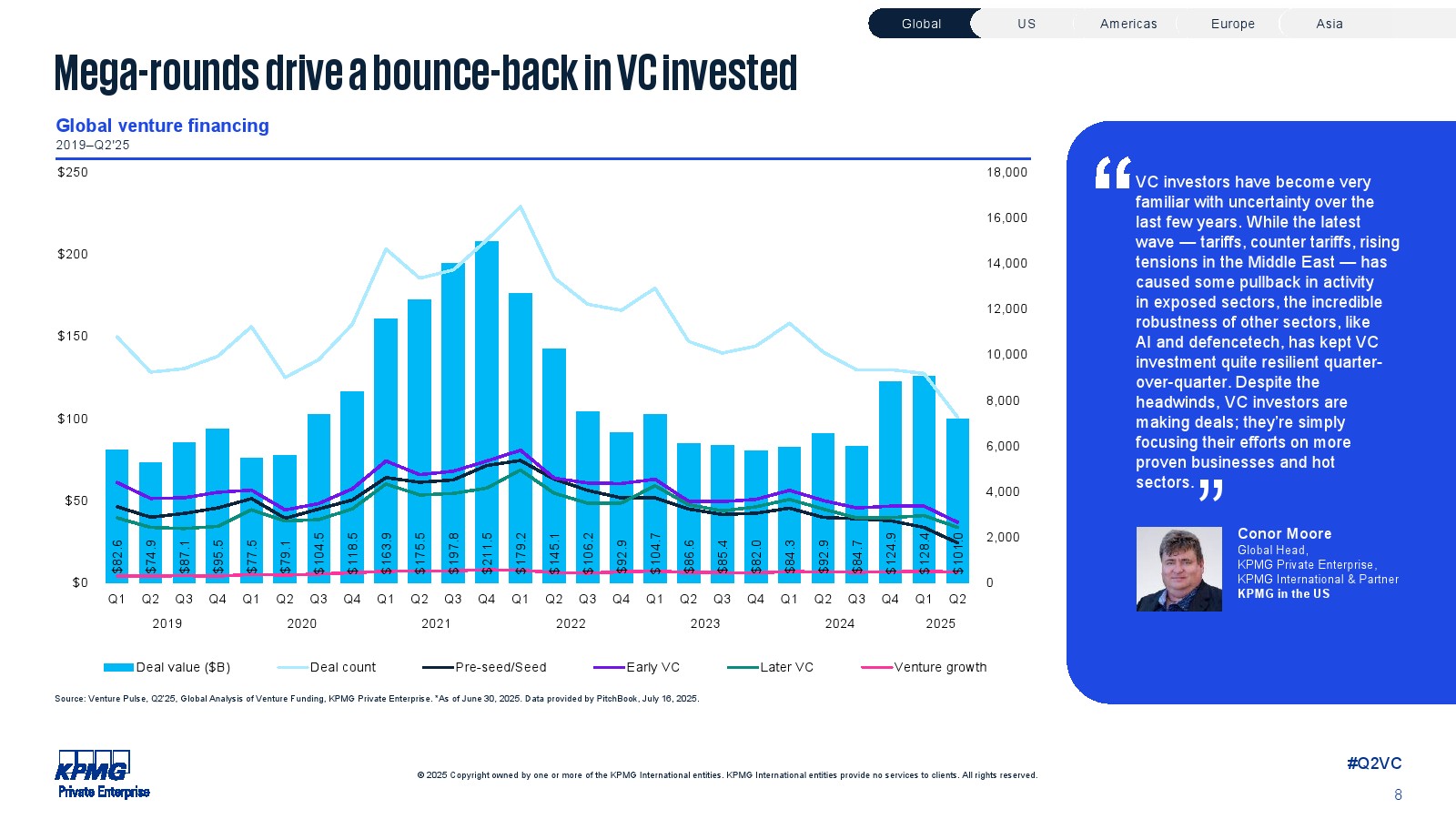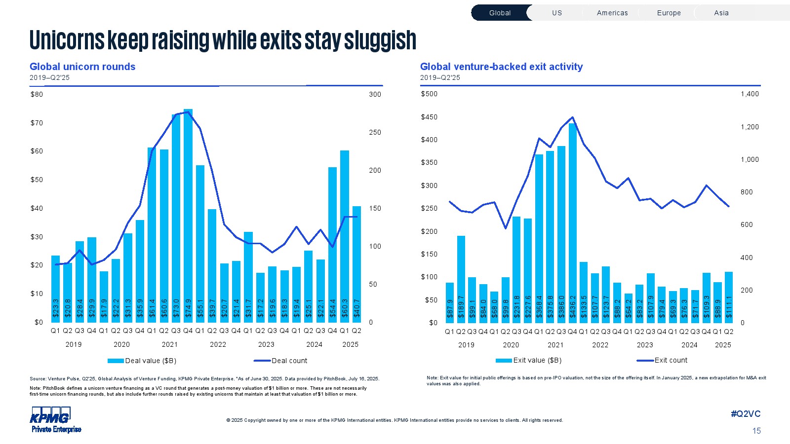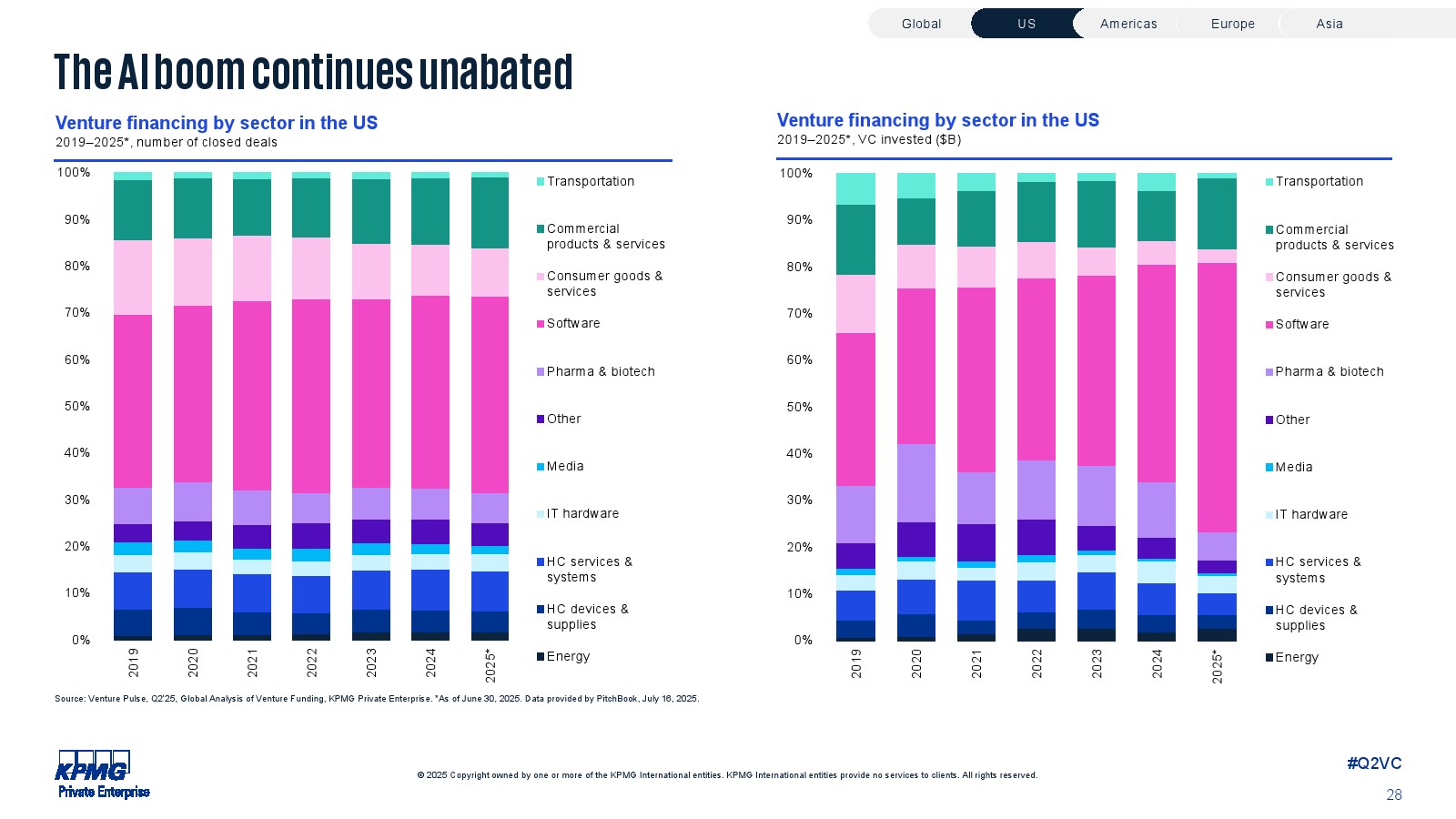 - 美洲风险第二季度投资环比从985亿美元降至727亿美元,主要受美国拖累——同期投资从930亿美元降至700亿美元。欧洲风险投资保持稳定(146亿美元),亚洲则遭遇十多年来最弱季度之一(2025年第二季度仅128亿美元)。