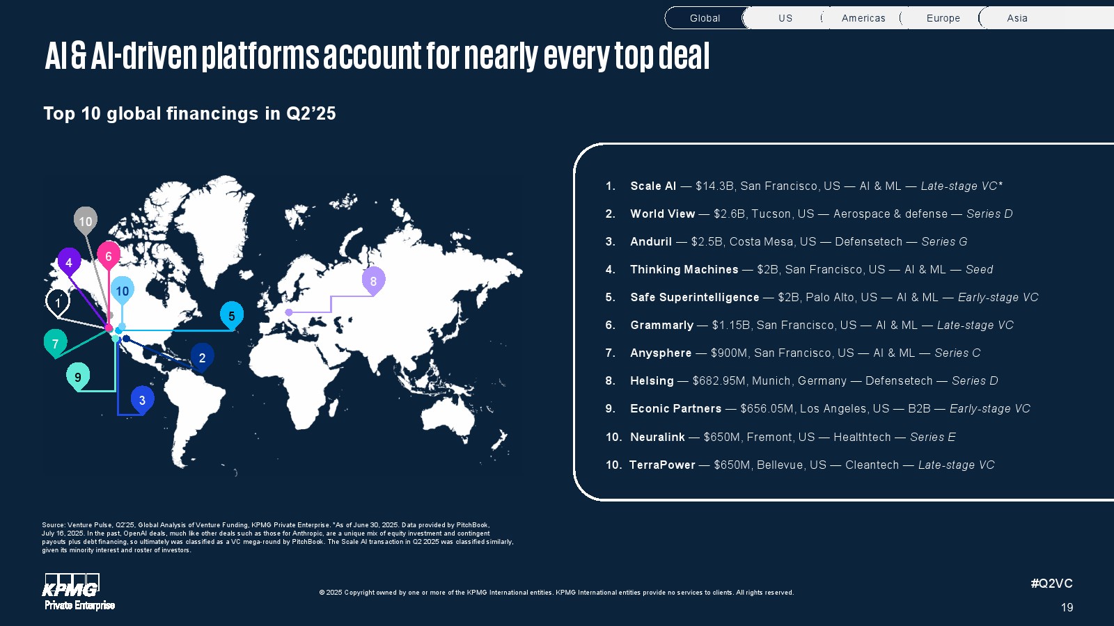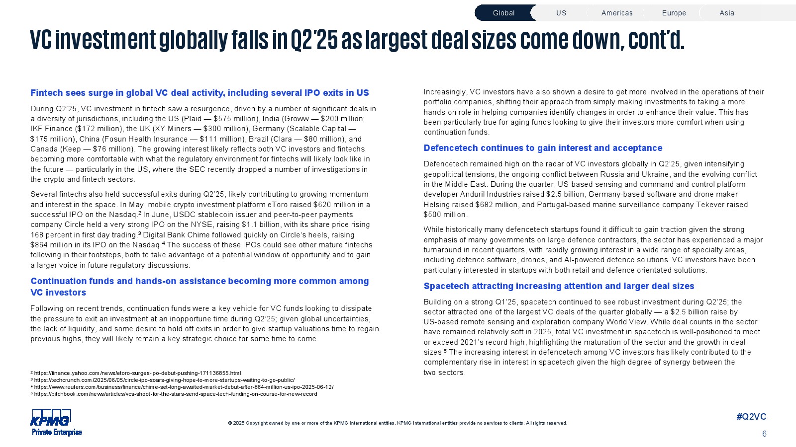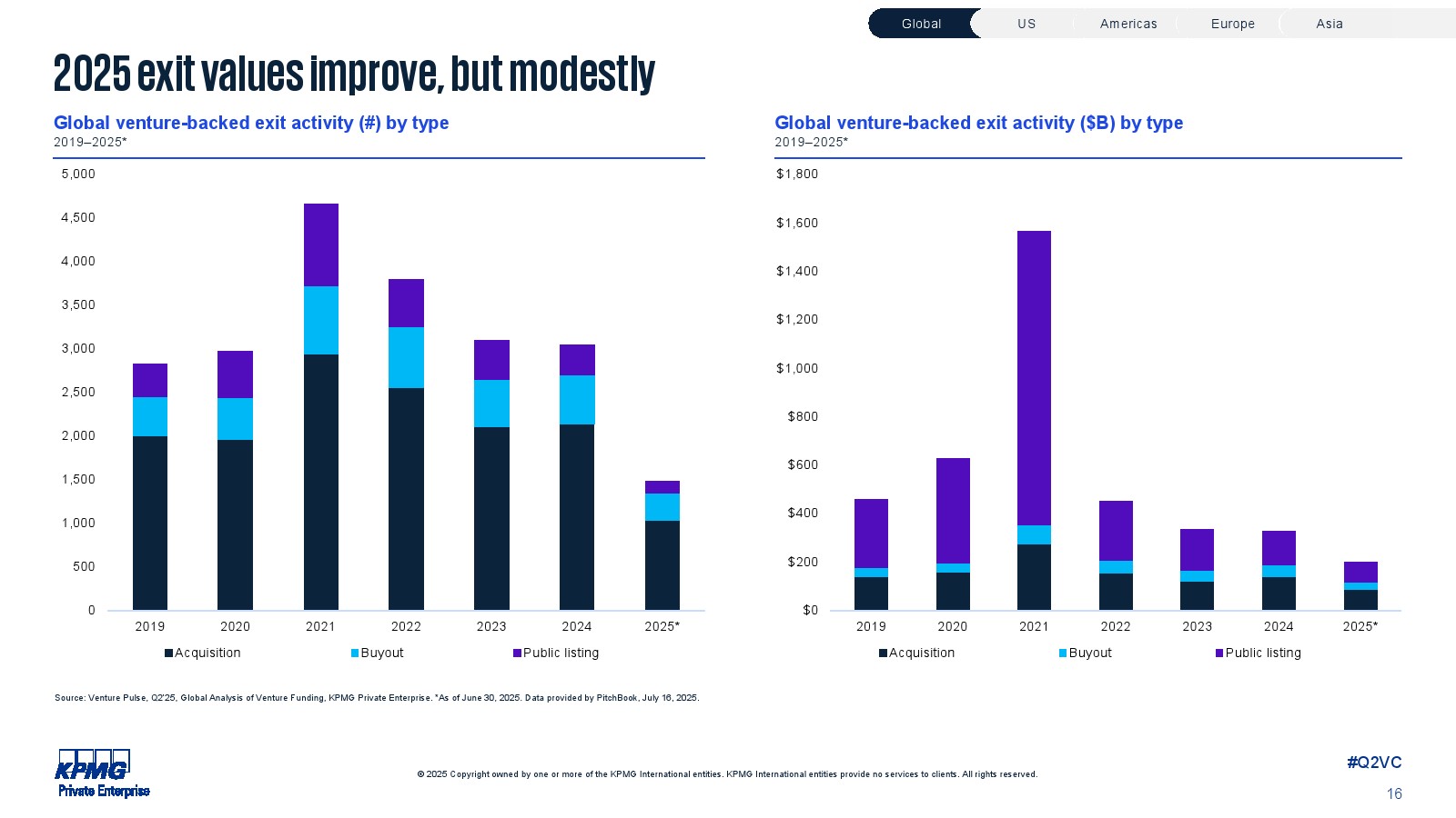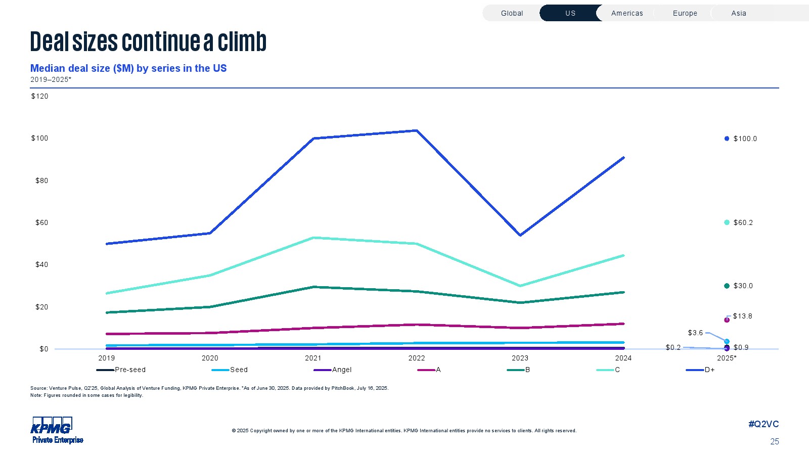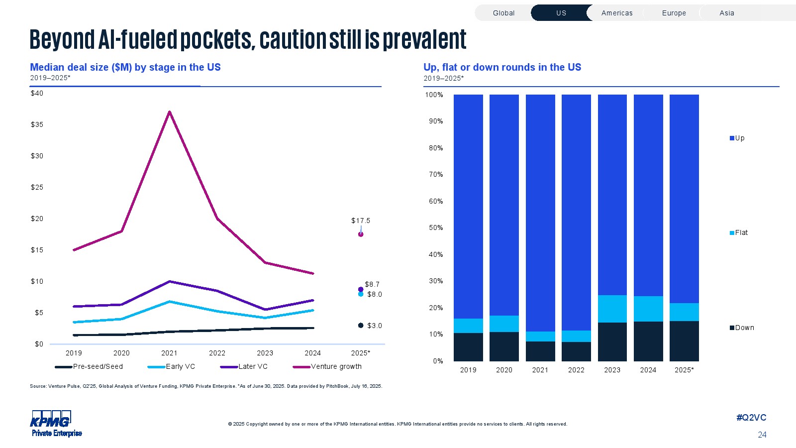 - 美洲风险第二季度投资环比从985亿美元降至727亿美元,主要受美国拖累——同期投资从930亿美元降至700亿美元。欧洲风险投资保持稳定(146亿美元),亚洲则遭遇十多年来最弱季度之一(2025年第二季度仅128亿美元)。