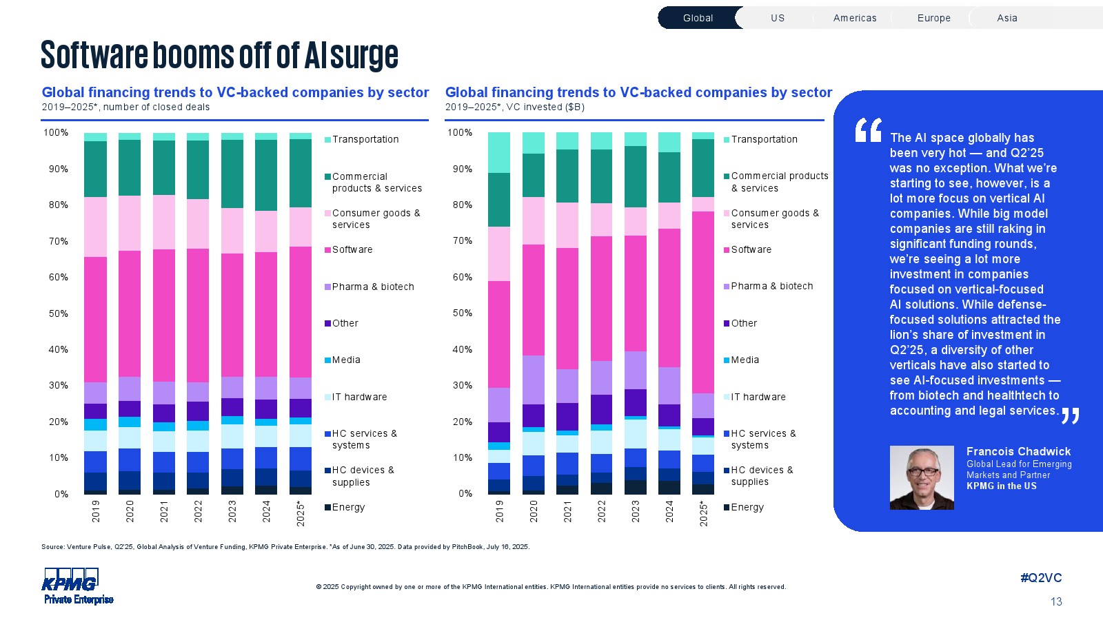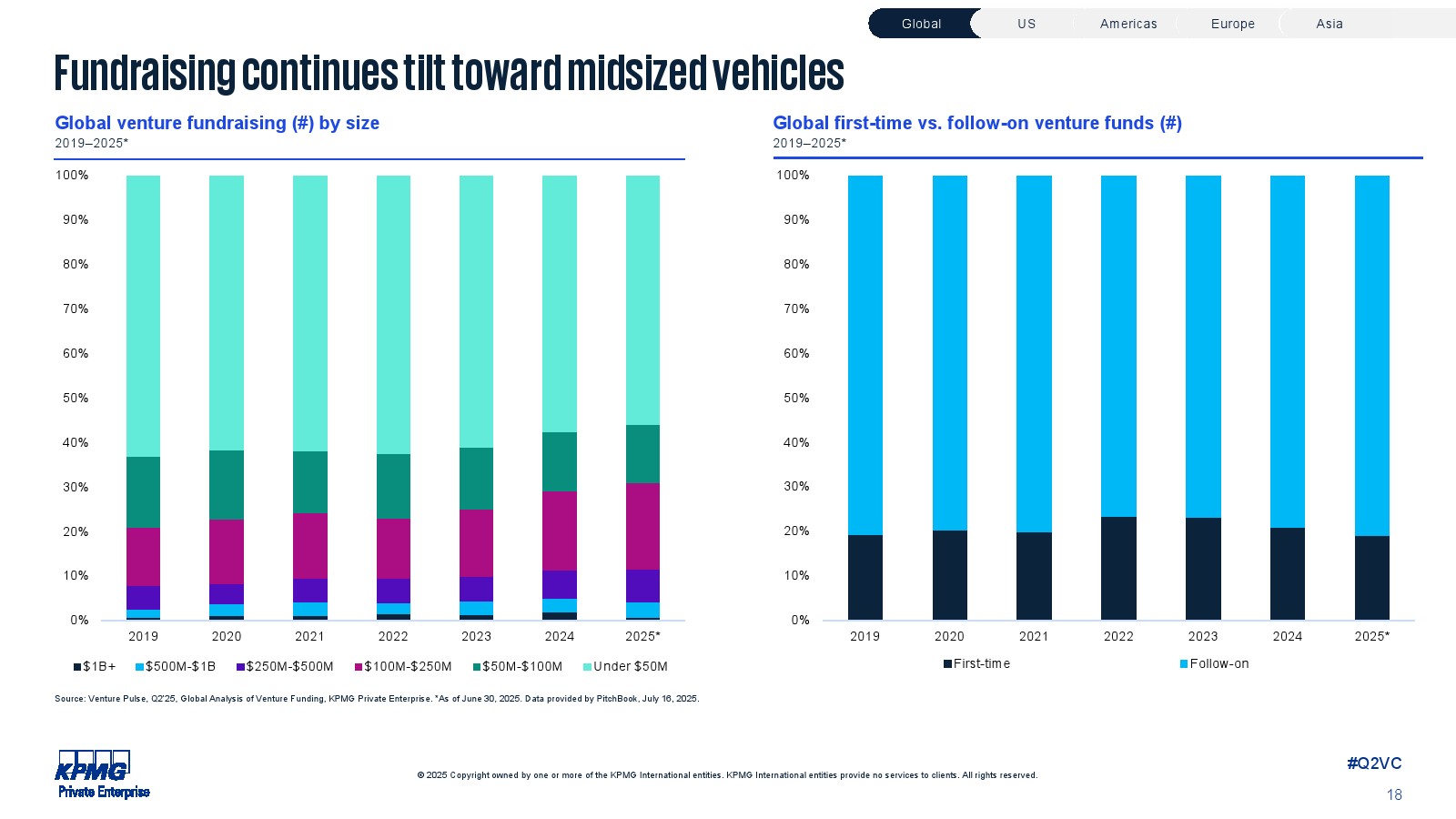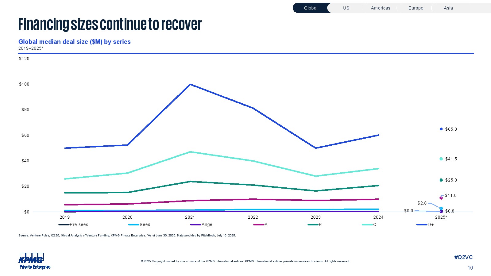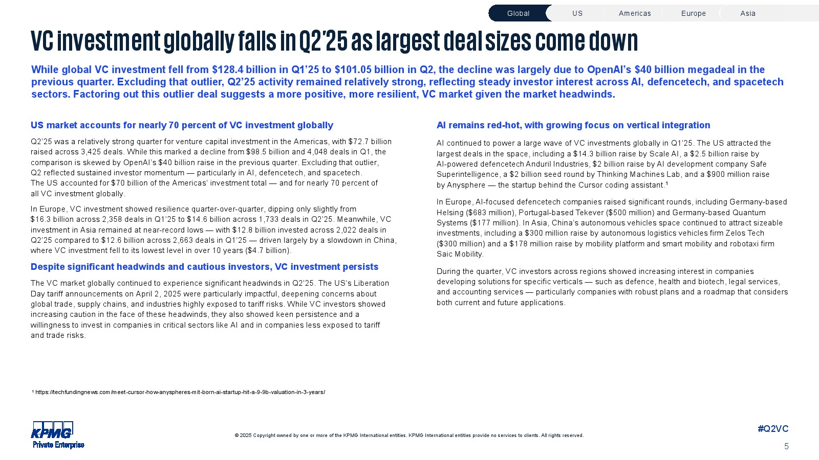 - 美洲风险第二季度投资环比从985亿美元降至727亿美元,主要受美国拖累——同期投资从930亿美元降至700亿美元。欧洲风险投资保持稳定(146亿美元),亚洲则遭遇十多年来最弱季度之一(2025年第二季度仅128亿美元)。