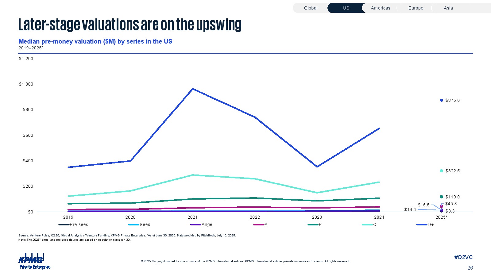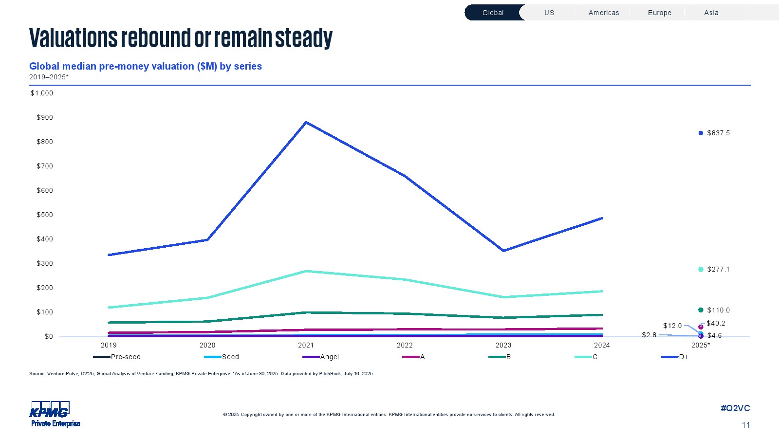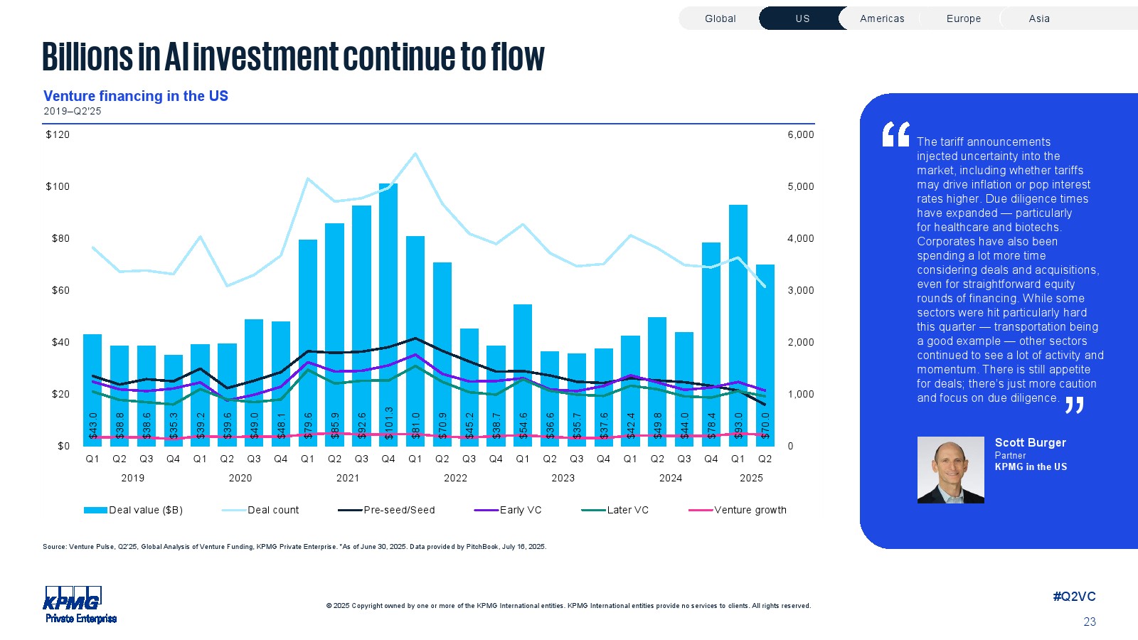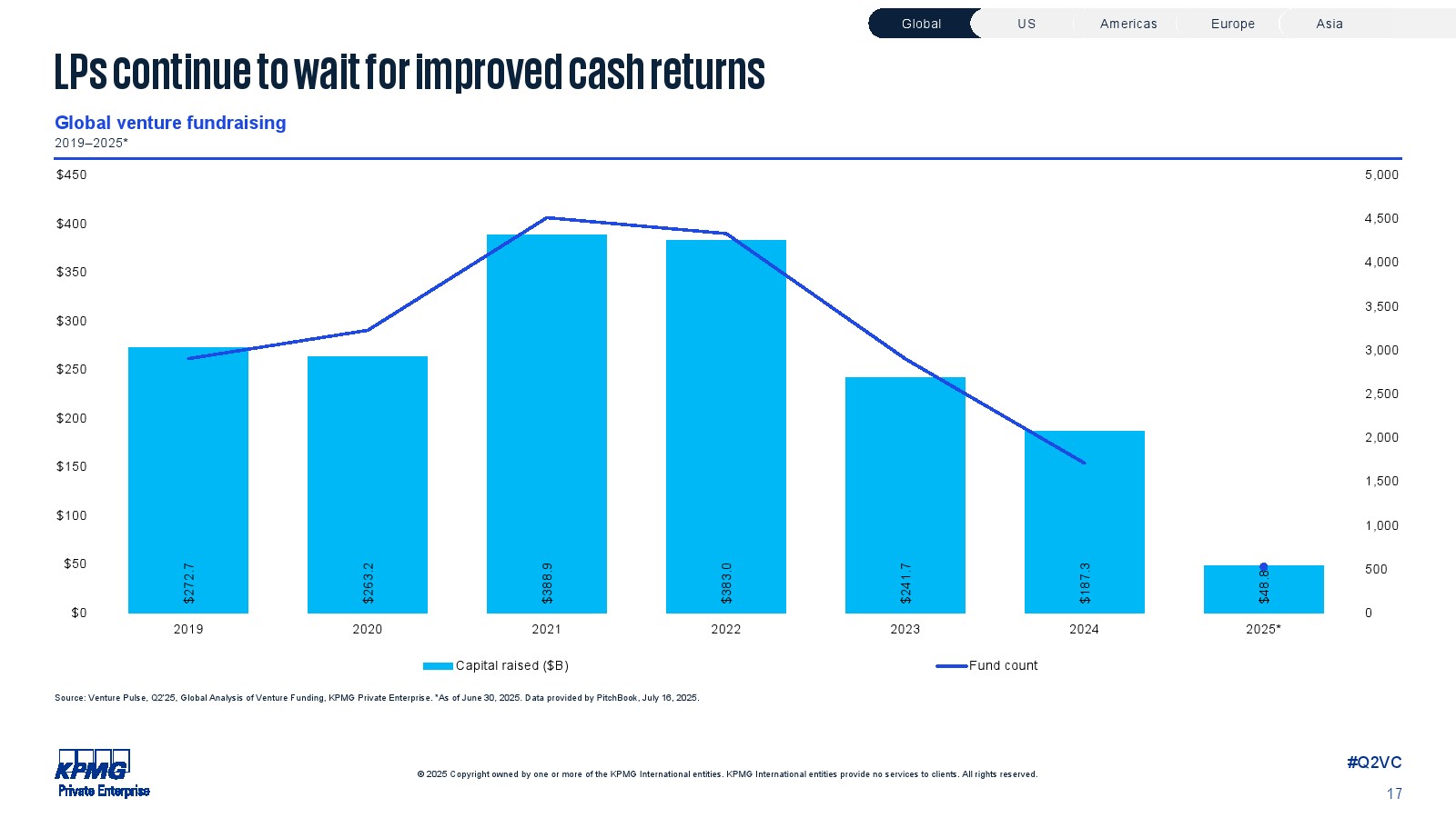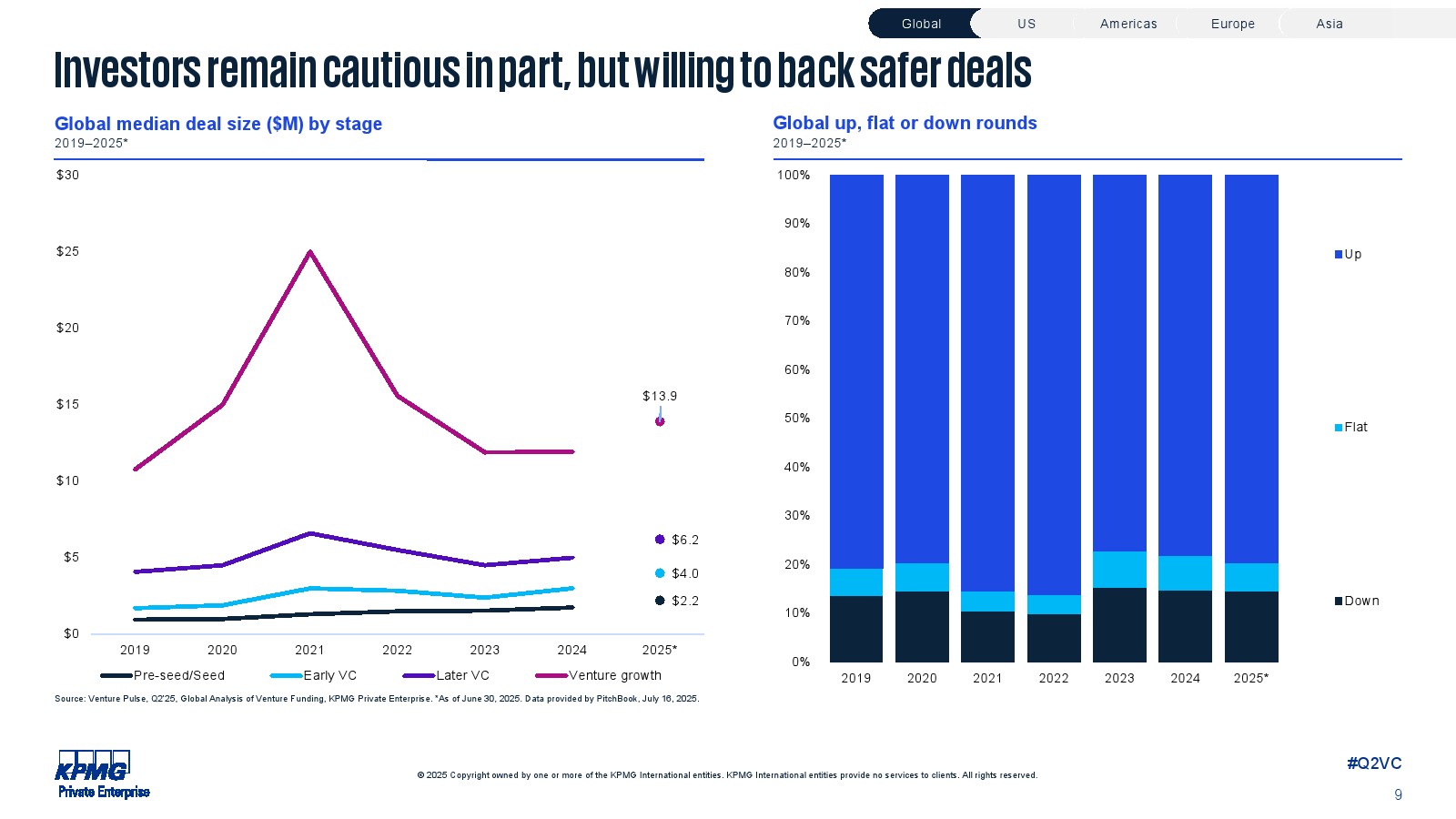- 美洲风险第二季度投资环比从985亿美元降至727亿美元,主要受美国拖累——同期投资从930亿美元降至700亿美元。欧洲风险投资保持稳定(146亿美元),亚洲则遭遇十多年来最弱季度之一(2025年第二季度仅128亿美元)。
