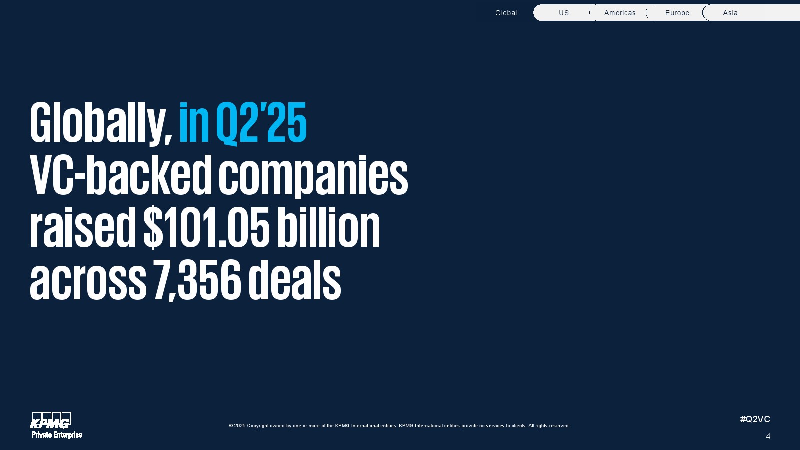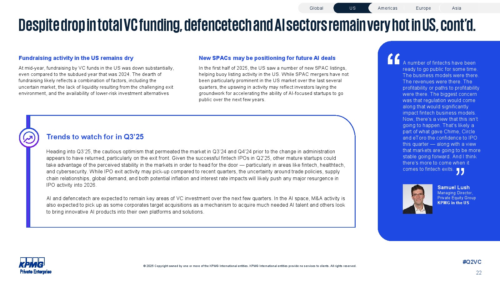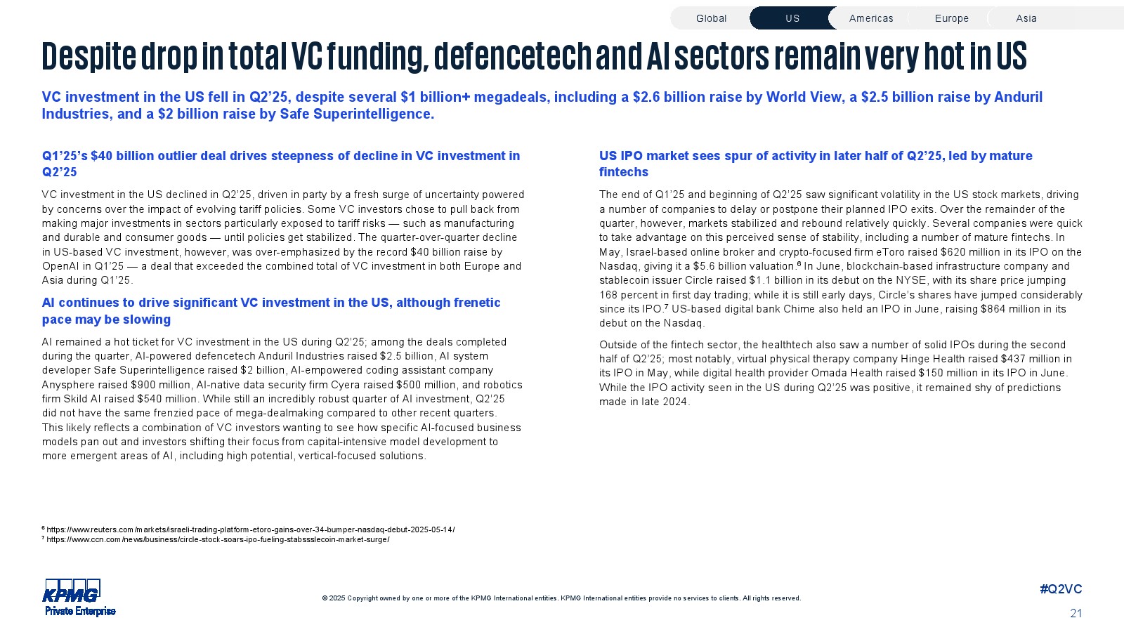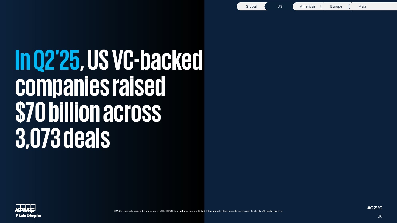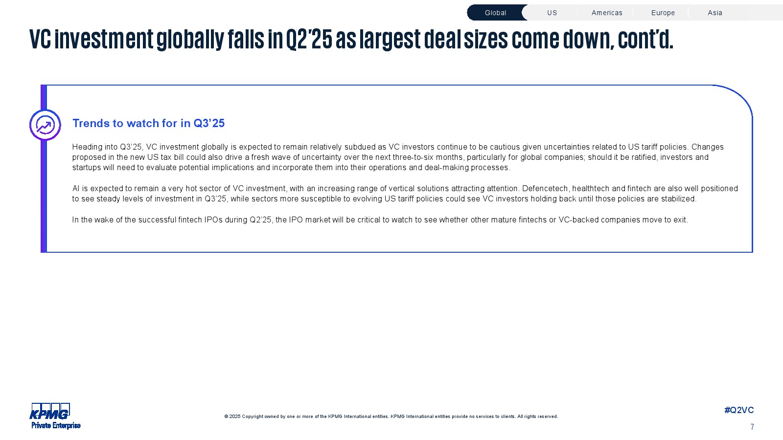 - 美洲风险第二季度投资环比从985亿美元降至727亿美元,主要受美国拖累——同期投资从930亿美元降至700亿美元。欧洲风险投资保持稳定(146亿美元),亚洲则遭遇十多年来最弱季度之一(2025年第二季度仅128亿美元)。