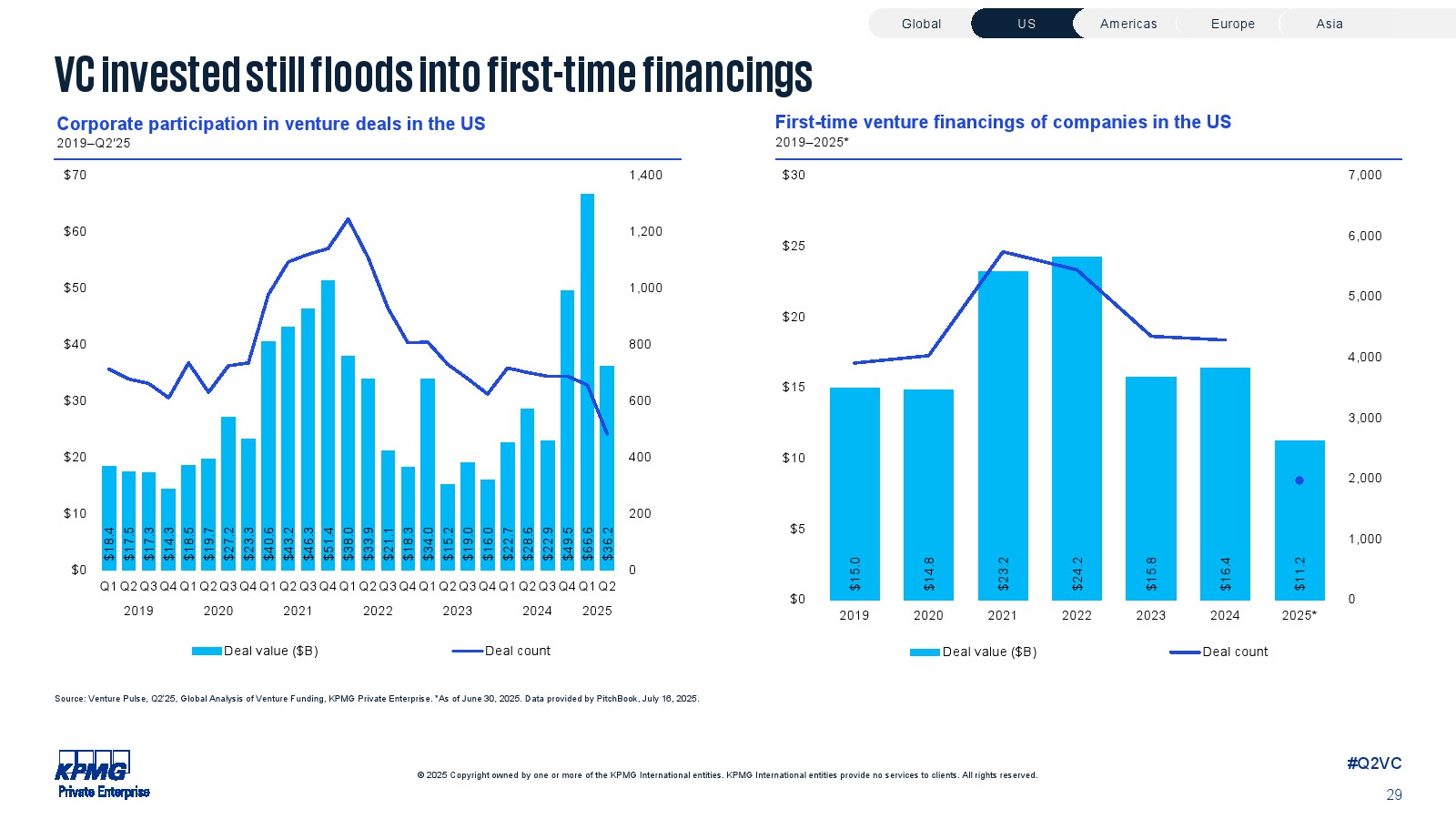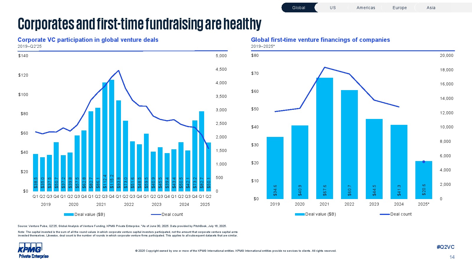- 企业风险投资(CVC)从2025年第一季度的827亿美元降至2025年第二季度的502亿美元,其中美国占362亿美元。亚洲CVC创十年新低,60亿美元。