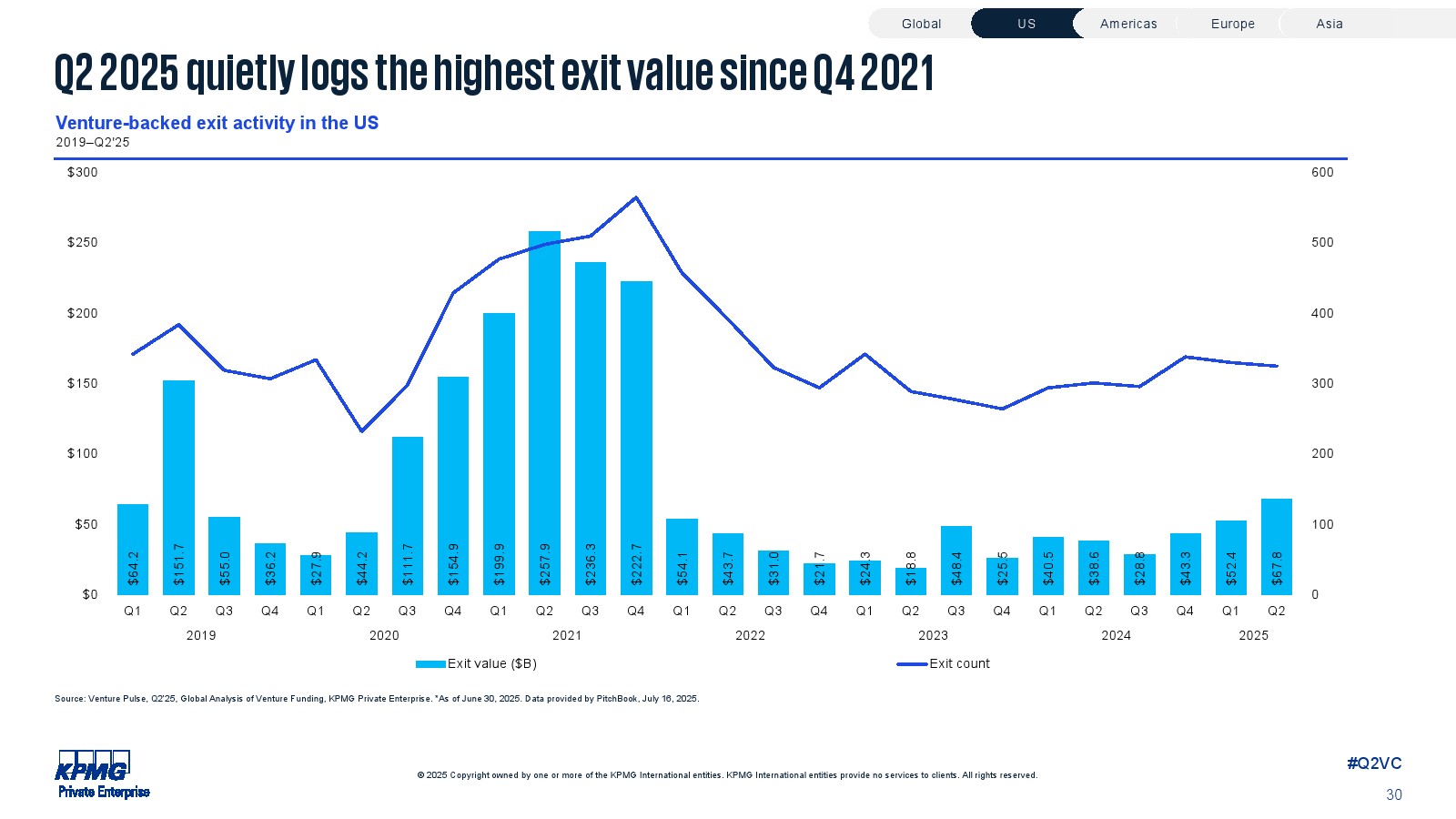 - 全球投资退出价值从第一季度的889亿美元升至第二季度的1,111亿美元。美国投资退出额从524亿美元增至678亿美元,亚洲从192亿美元增长至297亿美元,欧洲则从136亿美元降至116亿美元。
