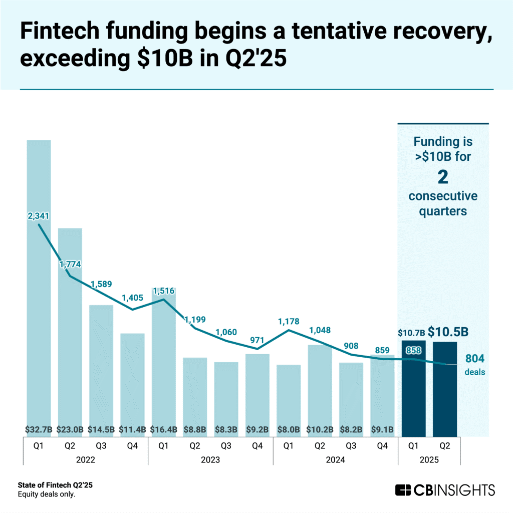 金融科技融资在2025年第二季度保持稳定,达到105亿美元,这是自2023年初以来首次连续两个季度超过100亿美元。