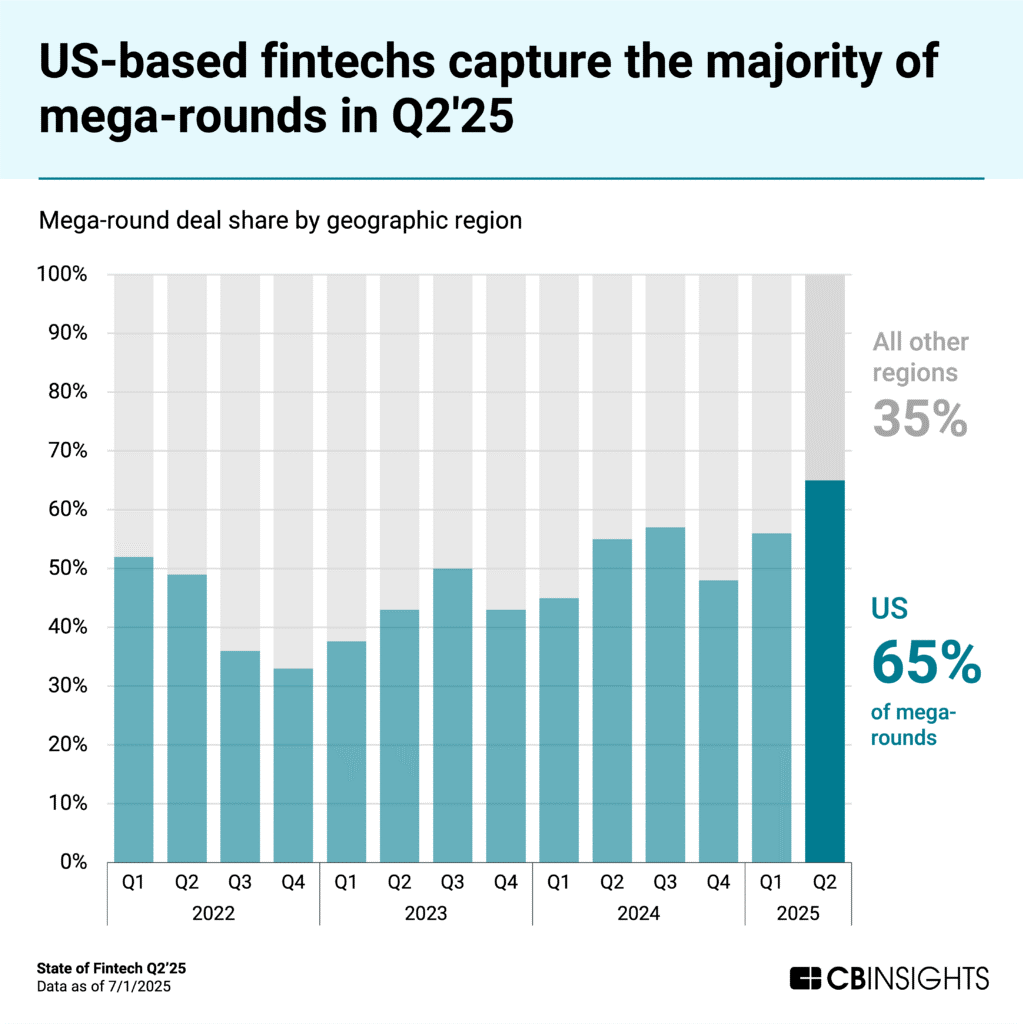 美国公司在2025年第二季度占65%的超大额融资轮次,创历史新高。美国金融科技公司还获得了71%的超大额融资资金。