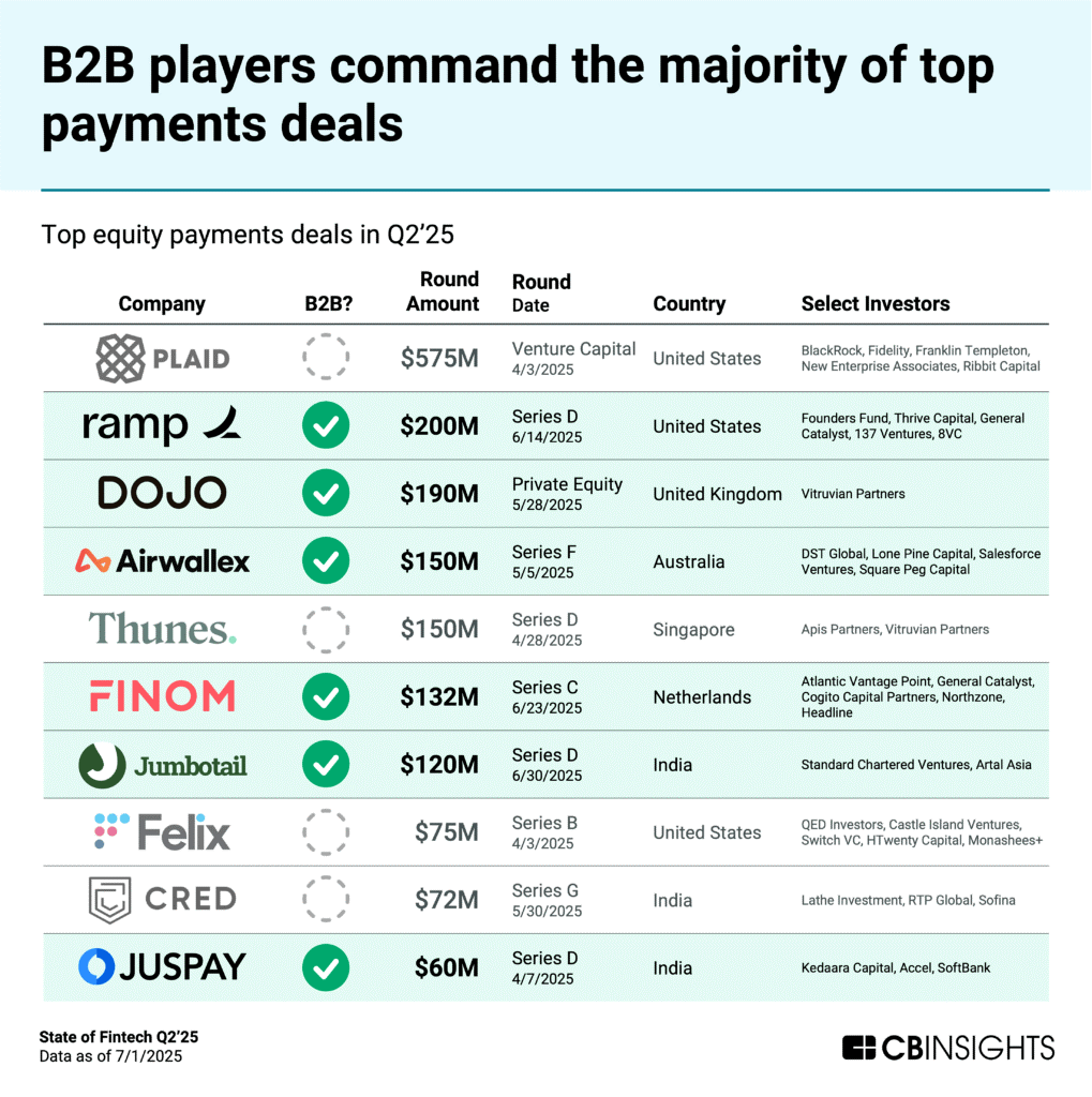 B2B金融科技公司在2025年第二季度占据主导地位,获得了前10大支付股权投资的60%和前10大银行股权融资轮的50%。