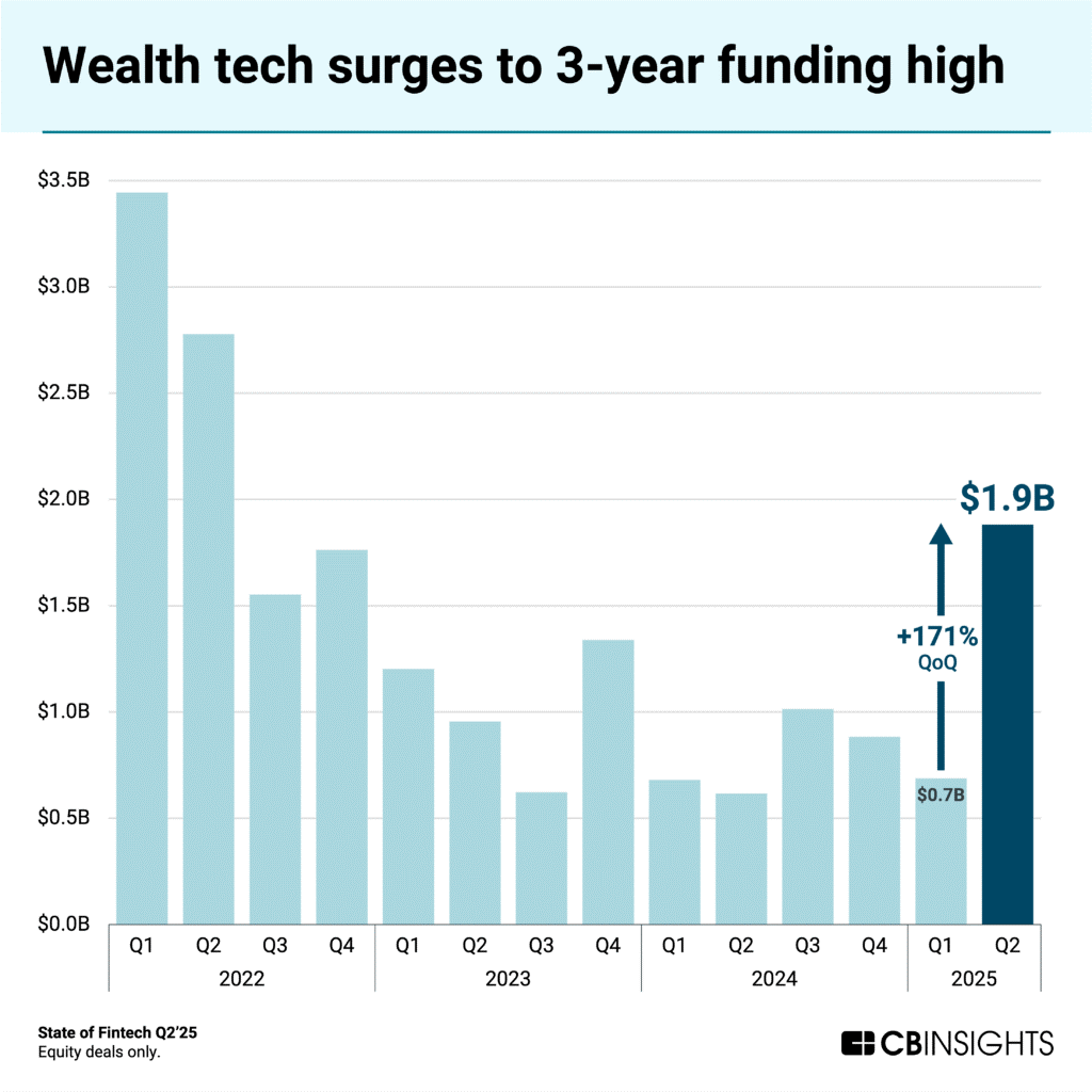 2025年第二季度是财富科技的转折点,该分支行业融资达19亿美元,几乎是上一季度的三倍,也是自2022年第二季度以来的最高水平。