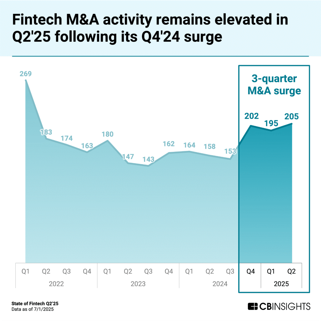 金融科技并购交易在2025年第二季度增至205笔,此前在2024年第四季度已有显著增长。