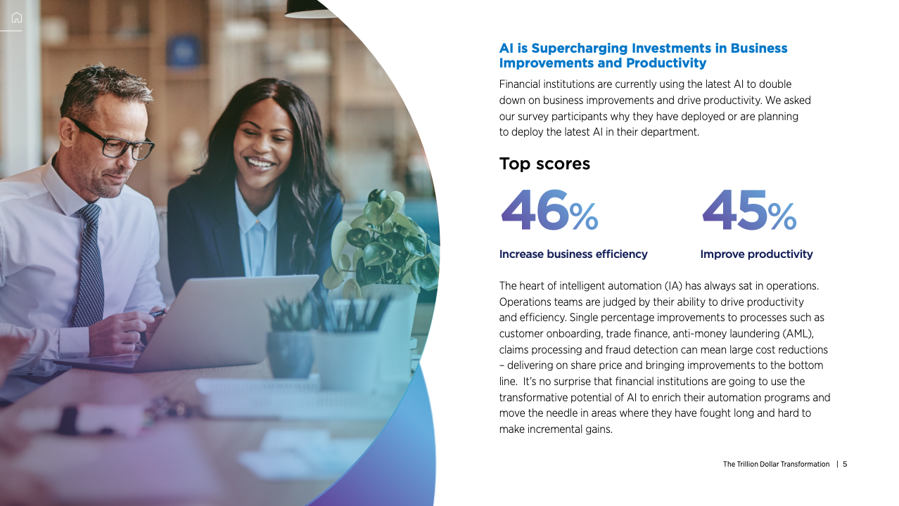 此轮AI投资浪潮的核心驱动力,源于对运营效率和生产力提升的极致追求。数据显示,46%的机构旨在提升业务效率,而45%则聚焦于提高生产力。在客户引导、反洗钱、欺诈侦测等关键领域,即便是个位数的效率提升,也意味着巨大的成本节约和利润改善,这正是金融机构不遗余力投入AI的根本动因。