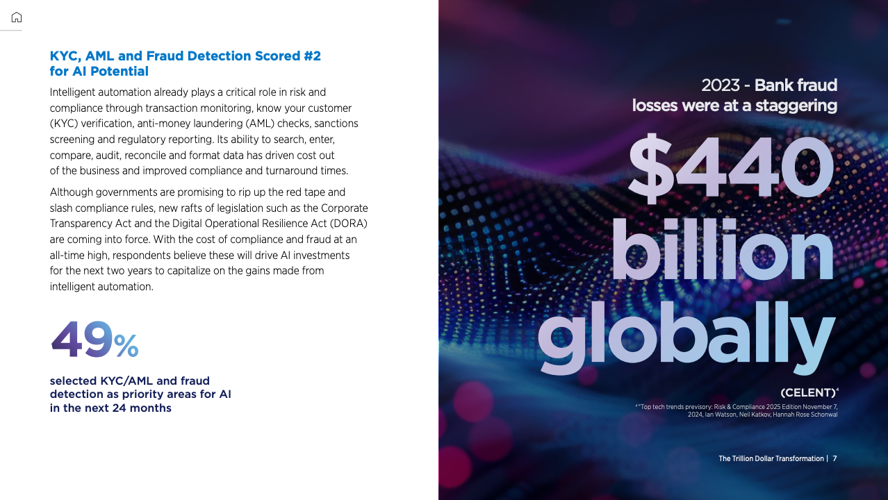 投资的具体落点呈现出清晰的“内外兼修”格局。对外,53%的受访者认为客户体验与支持是未来两年AI最具潜力的应用领域,预示着超个性化服务将成为竞争焦点。对内,49%的机构将“了解你的客户”(KYC)、反洗钱(AML)及欺诈侦测列为优先事项,以应对2023年全球高达4400亿美元的银行欺诈损失。