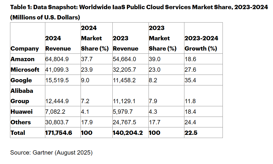 根据Gartner的数据,全球基础设施即服务(IaaS)市场在2024年增长了22.5%,达到1718亿美元。2024年,亚马逊在IaaS市场上保持了第一的位置,紧随其后的是微软、亚马逊、阿里巴巴和华为。